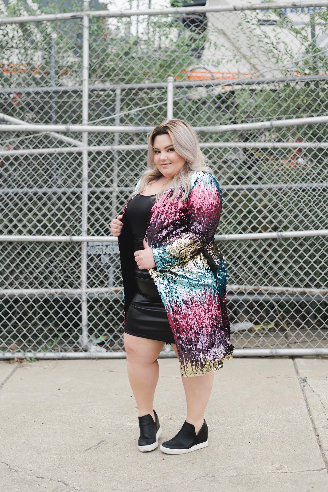 Because I am obsessed with sequins, yet again, I have included a shop widget of my FAVORITE plus size sequin pieces below for you to fall in love with! But first, let’s chat about my little sequin cardigan gem. The Rainbow Sequin Cardigan is from the Chicago-based boutique Inavie. It only runs up to a size large, but it fits me perfectly even though I usually wear a 2XL. I paired the cardigan with a latex-leather skirt, black tank top, and wedge sneakers. Because the cardigan does most of the talking, I wanted to keep the rest of the outfit pretty simple. But this leather skirt kept the look sexy—The Glam Mom let me borrow the skirt for this shoot!