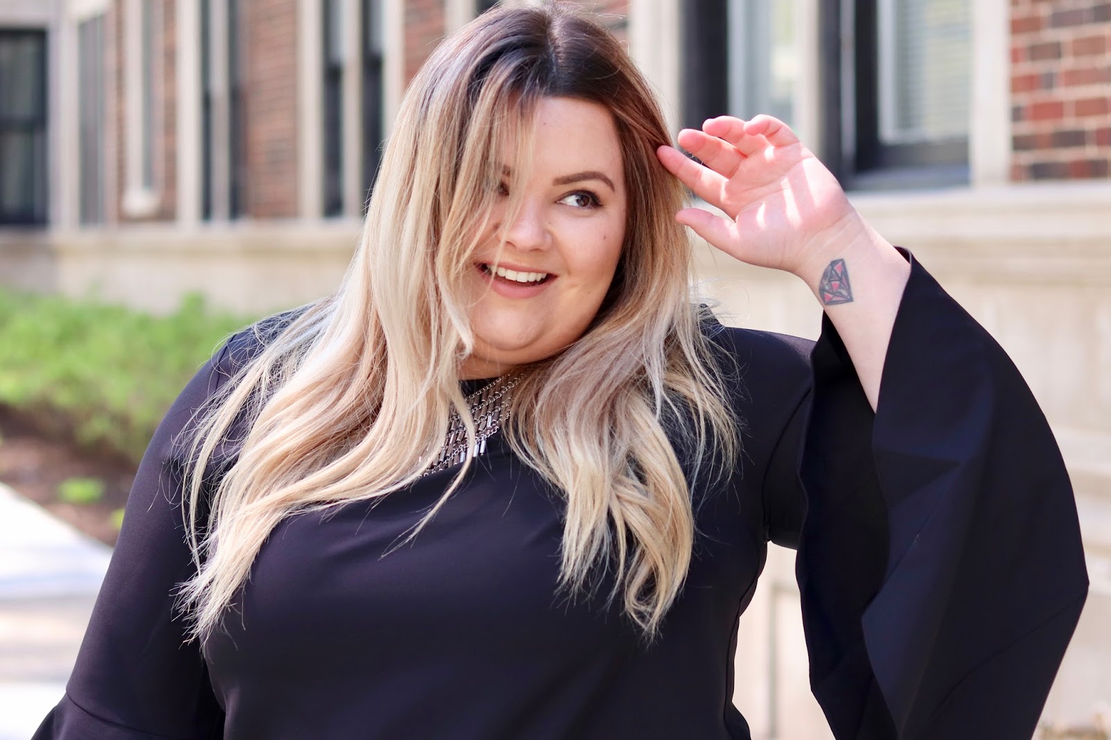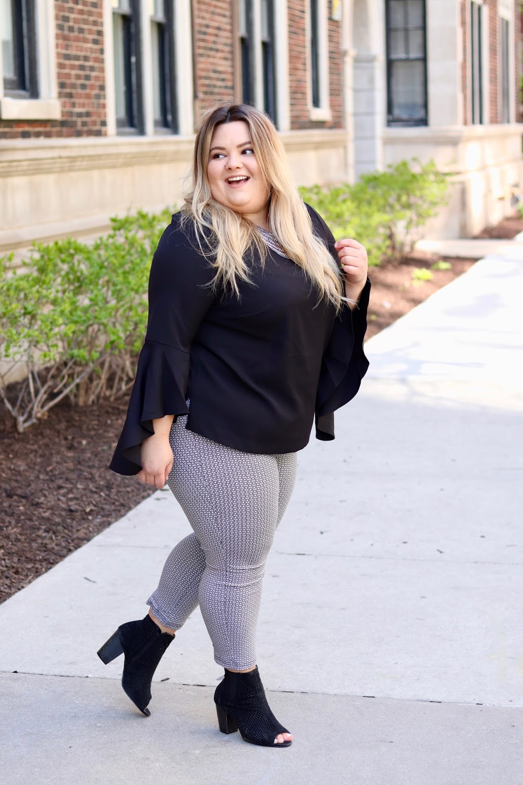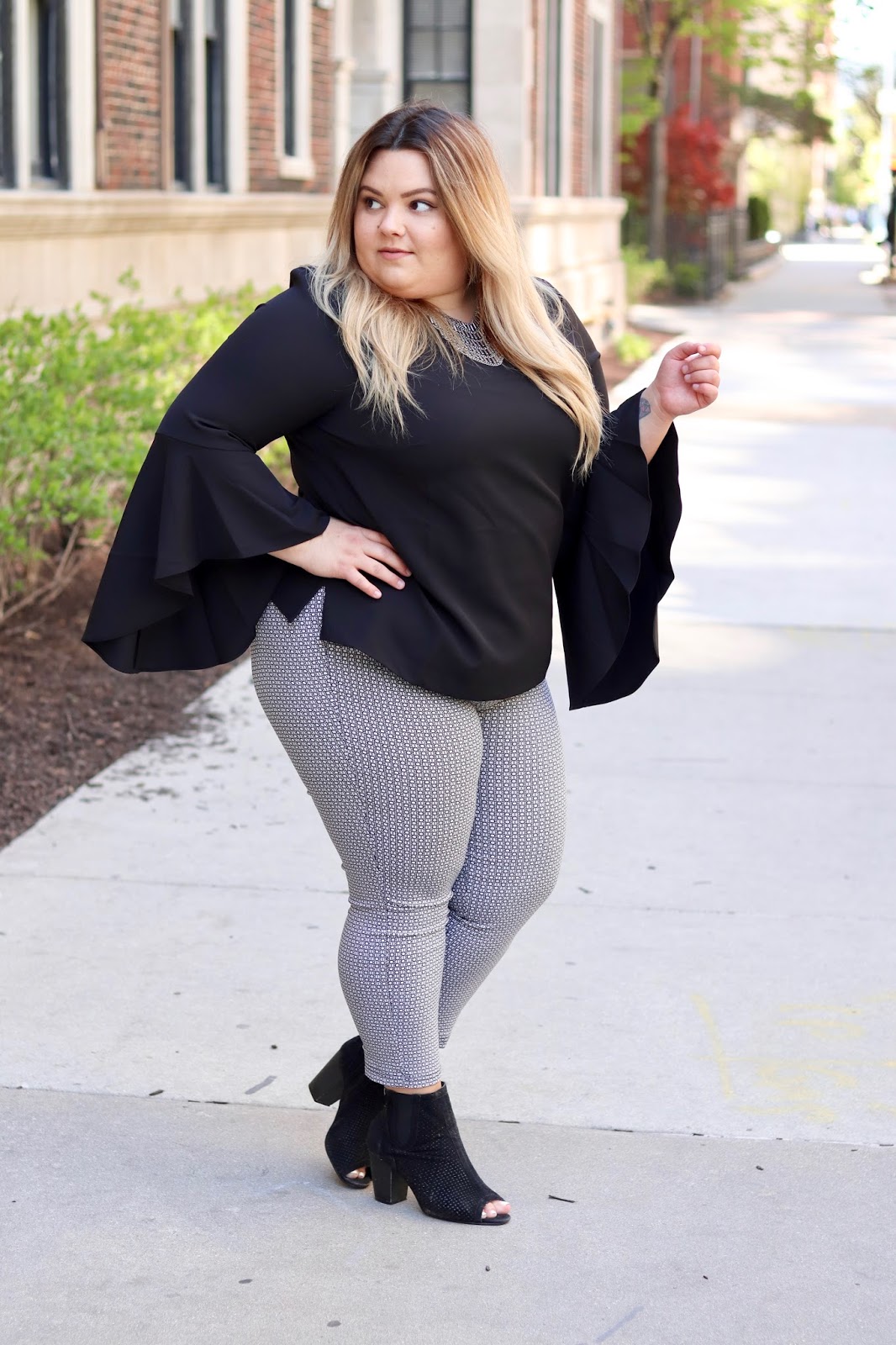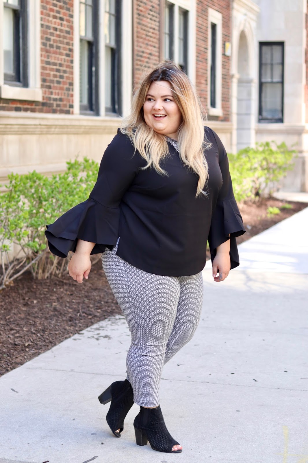 My work attire is usually an all black ensemble. However, I really love fun tops and blazers to spice up my look every once in awhile, hence this sequin blazer and the beautiful flounce elbow bell sleeve blouse that I am wearing. I scored this blouse from Eloquii, which is where I always find treasures that fit seamlessly into my office wardrobe. The brand really captures the perfect plus size girl boss on the go—that’s a mouthful, but you get what I mean! Eloquii is like the more polished, plus size Zara.