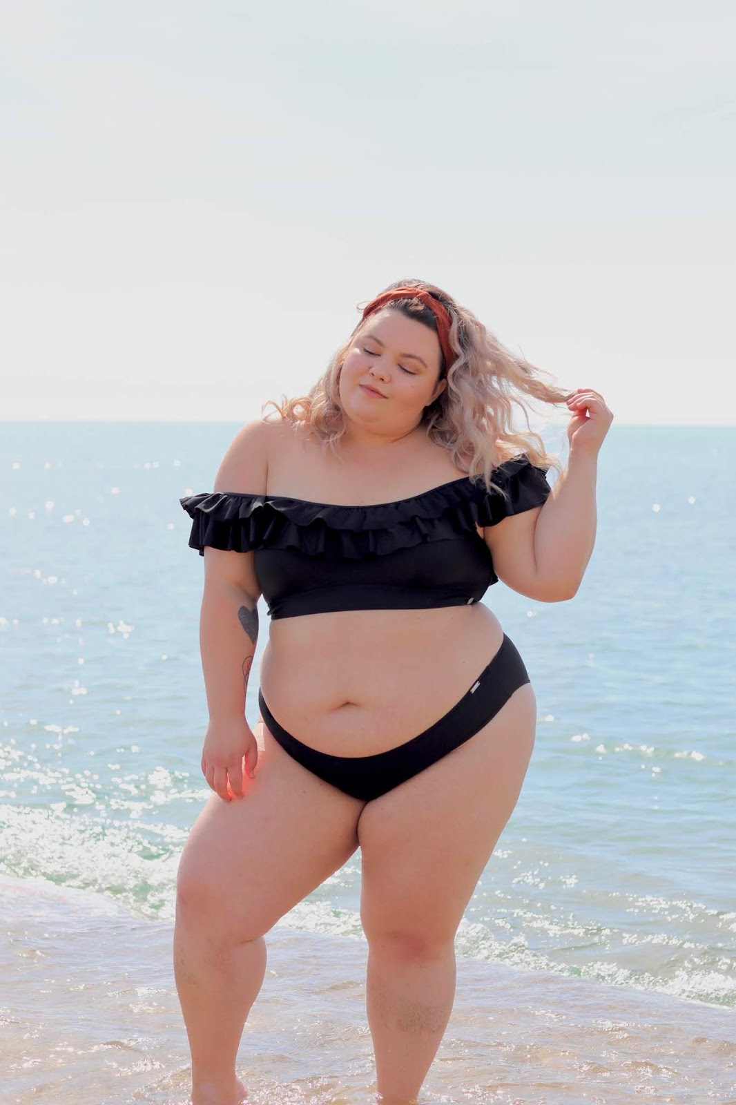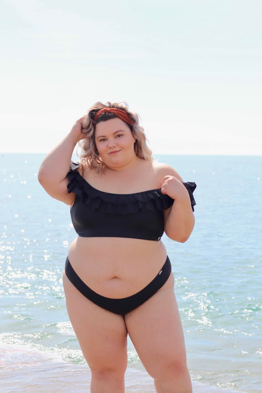 SIZING INFO: I am wearing a size 18 in both the Plain Black Frilled Bikini Top and the Chlorine Resistant Plain Black Pant, which is my usual size, and they fit perfectly! I think it’s common that all swimwear fits a little snug at first and then conforms to your body. With that being said, the swimsuit is a little tight, but I think that’s normal! I am wearing a XXL in the Black Mesh Short Tie Skirt Bottom, which is my usual size, and it fits perfectly!