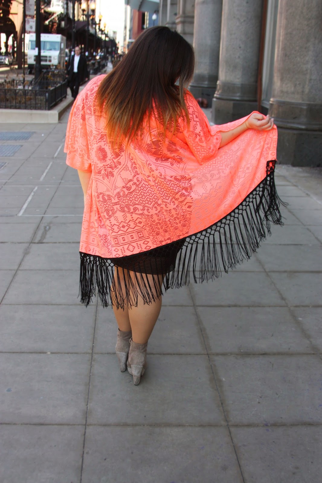 This black dress has a longer hemline, but the see-through stripes give this dress a sexy edge. Last summer, I fell in love with kimonos. However, I only liked them if they were beige or black. This bright, coral kimono made me step outside of my comfort zone and I cannot wait to see how many things I can pair it with.