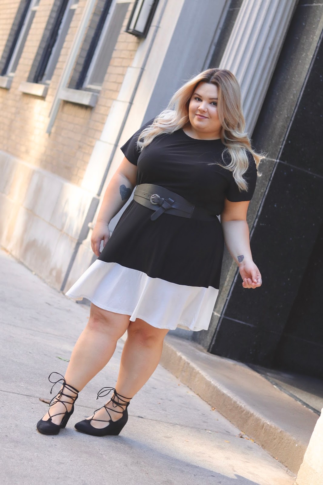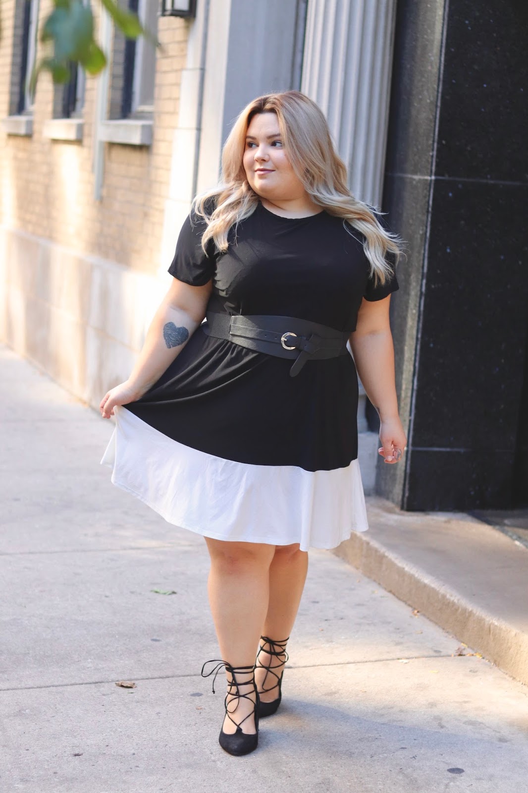 And now, onto this outfit, shall we? I found this color-blocked dress in the crowded racks of Marshall’s. The white detail on the bottom is what caught my eye. Could it be a separate piece of fabric? A polyester slip underneath the black dress? These are questions I pondered as I struggled to untangle the hanger from the clothing rack. I was surprised to see that the white detail was the opposite of my first two guesses, but I loved that it made me wonder. I paired the dress with a belt to make it hug my curves a little more. The dress normally falls just below my knees, which could drown out a short figure. However, I have worn the garment with and without the belt, and I love it either way. While I can’t find the exact dress, I will include a couple of similar ones below for you to shop! This Plus Size Chaps Colorblock Shift Dress is a dead ringer, though!