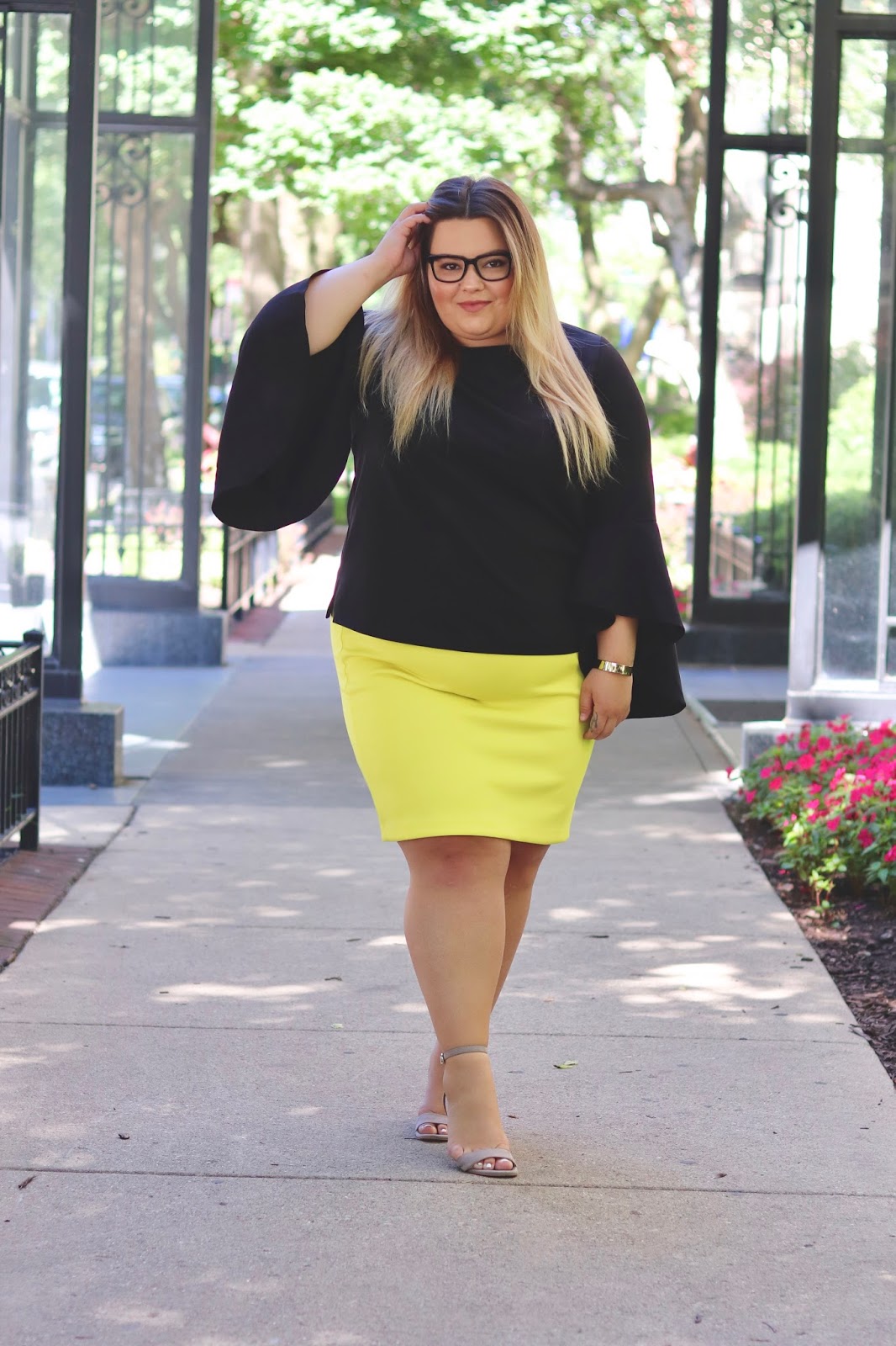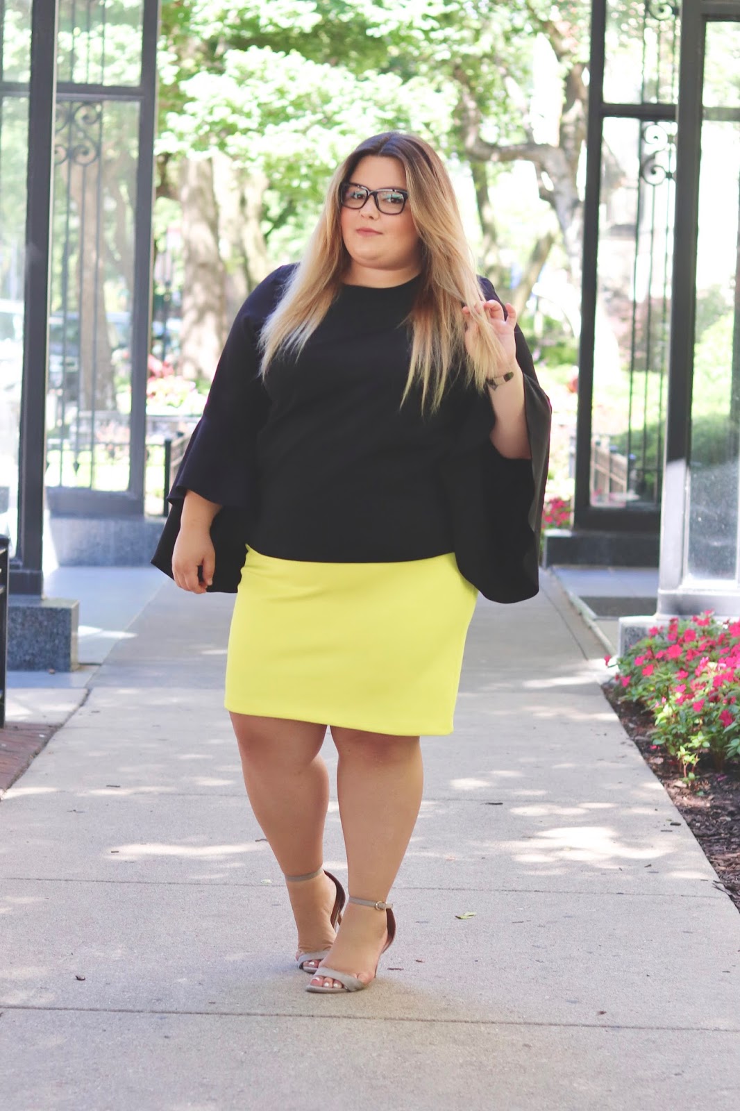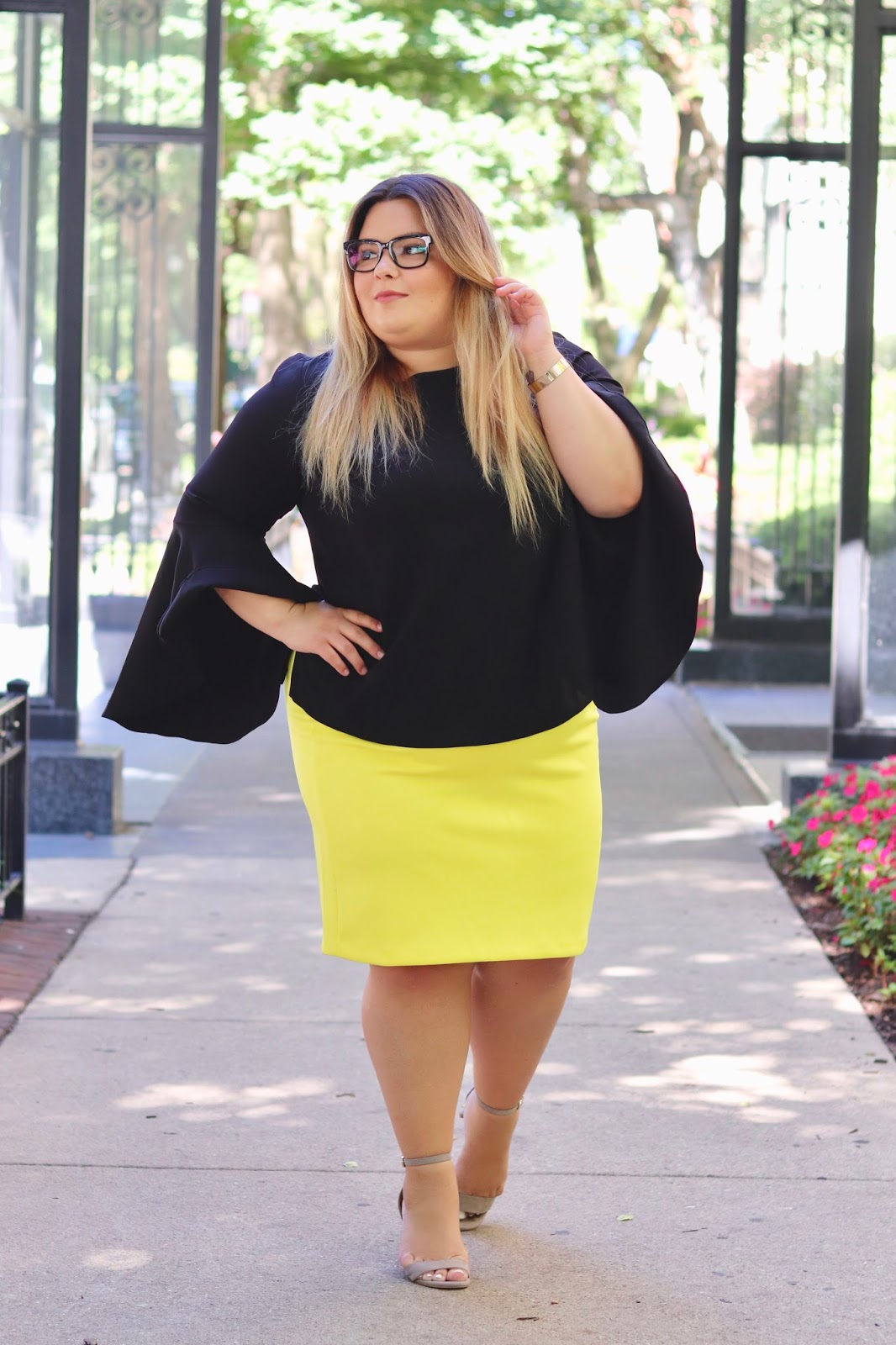 I spend most of my weekdays in the office—about 40 hours to be exact. So when I create an office look that I love, it’s a huge win because these are the outfits that I have to wear every day. Just because I have a dress code to follow at work, doesn’t mean that my outfits have to be boring and basic. For example, this ensemble totally adheres to my company’s dress code, but this electric yellow neoprene pencil skirt and the bell sleeves on this elbow flounce top from Eloquii fall far from average. And not to mention that I feel like a total boss when I am wearing this look!