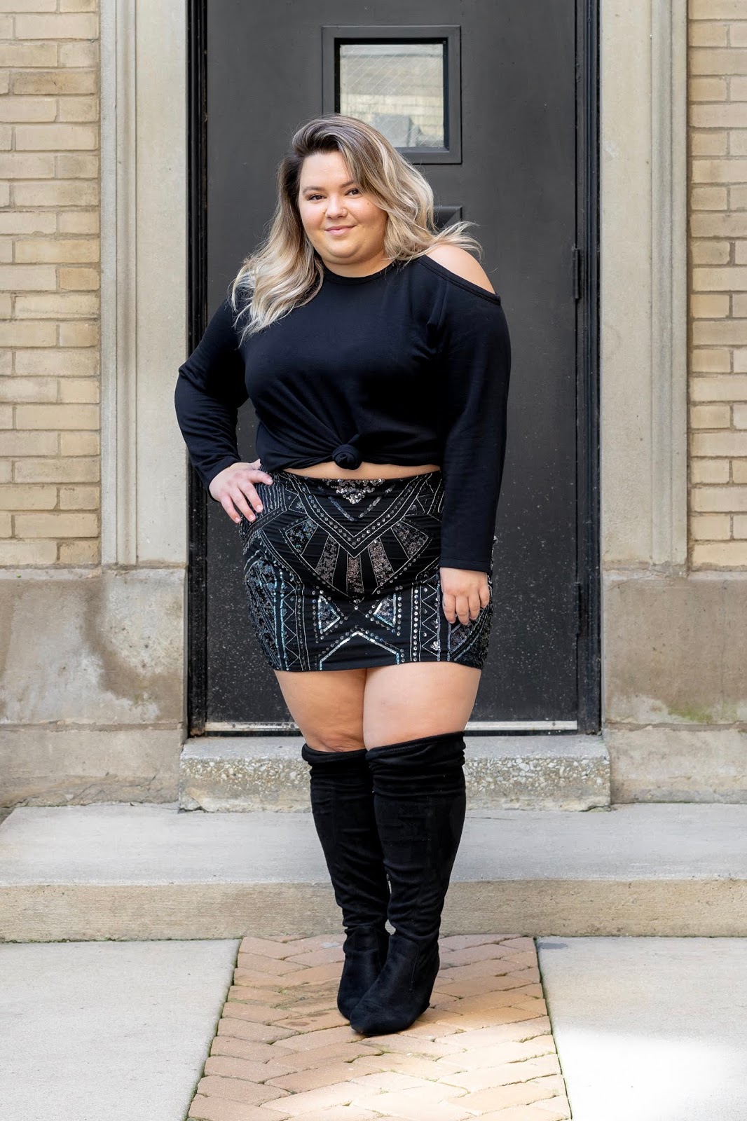 Chicago fashion blogger, Chicago plus size fashion blogger, natalie Craig, natalie in the city, plus size fashion, Chicago fashion, plus size fashion blogger, eff your beauty standards, fatshion, skorch magazine, Chicago model, plus size model, plus size petite, affordable plus size clothing, embrace your curves, plus model magazine, petite plus size, body positive, express plus sizes, sequin skirt, wide calf knee high suede boots, rebel Wilson x angels, cold shoulder