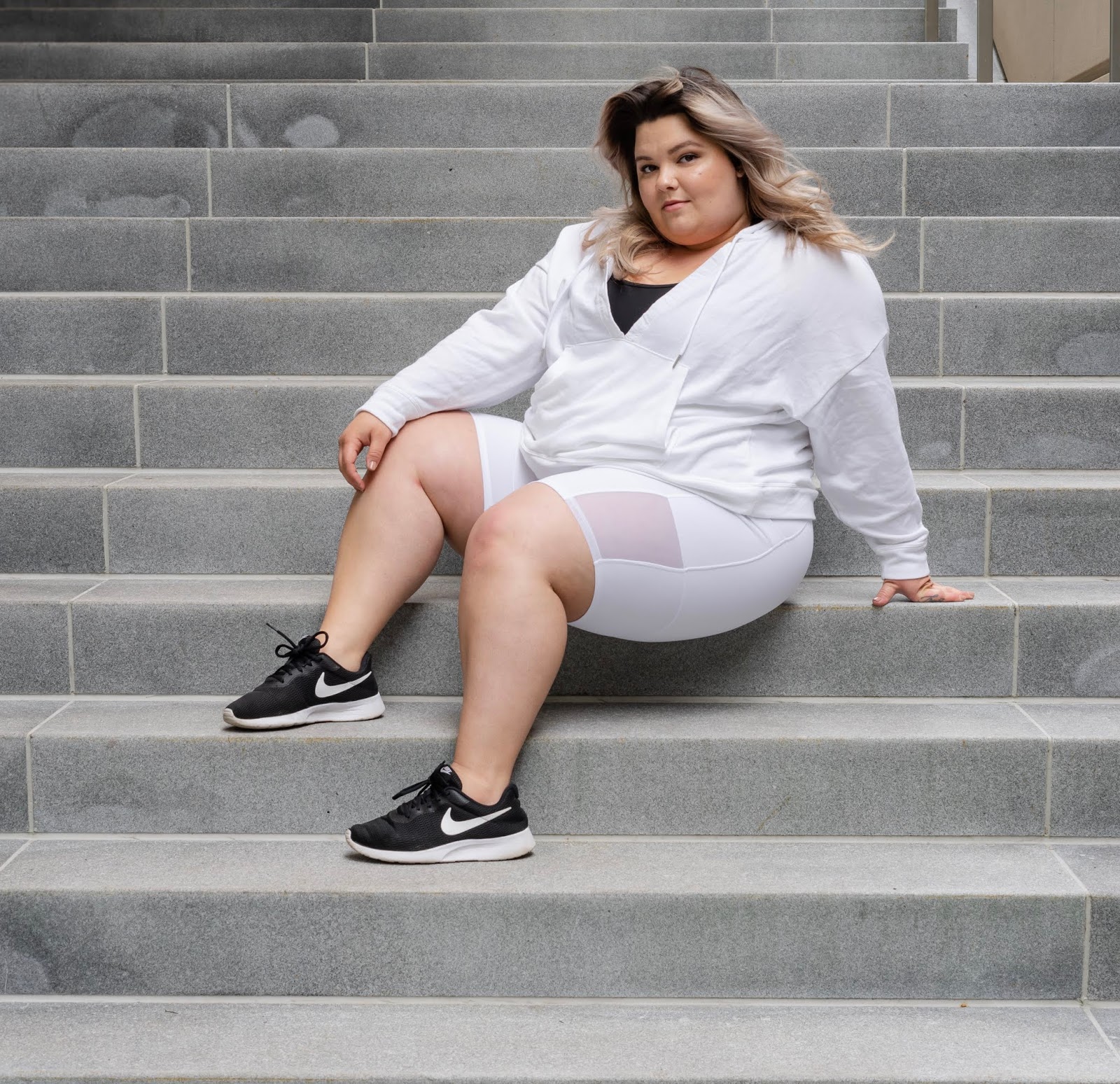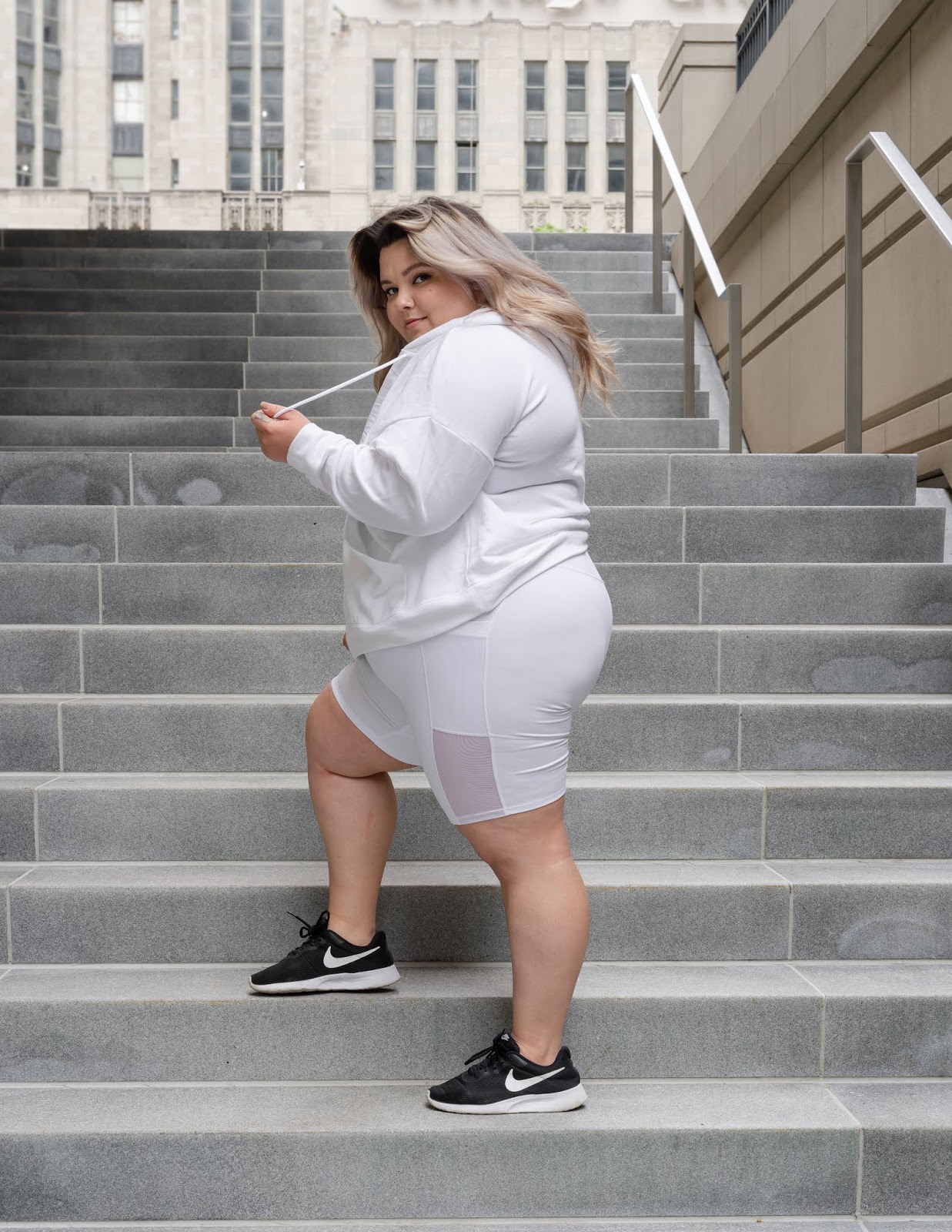 I put on clothes that I love, but I am afraid to try because I am plus size. I have strayed away from so many trends, colors, and styles because I was told I shouldn’t wear them because they wouldn’t look good on my curvy body. One of these things is the color white. Up until a couple of months, there was not a drop of white in my closet. I turn to black, which is a “flattering” color. Never once had I ever wanted anything white. But when I saw these Fabletics biker shorts, I knew this was going to be my next “challenger” outfit.