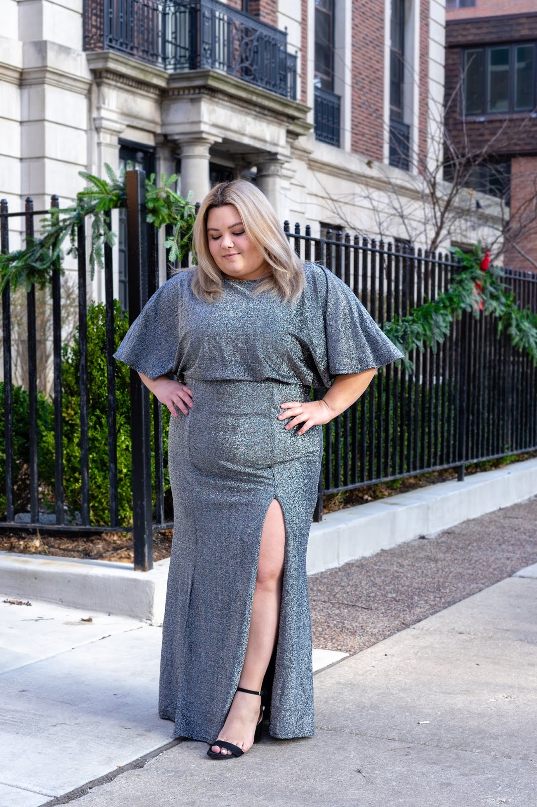 Chicago Plus Size Petite Fashion Blogger and model Natalie Craig styles plus size clothing brand Marée Pour Toi's holiday Doleman Shimmer Dress, debuted at CurvyCon