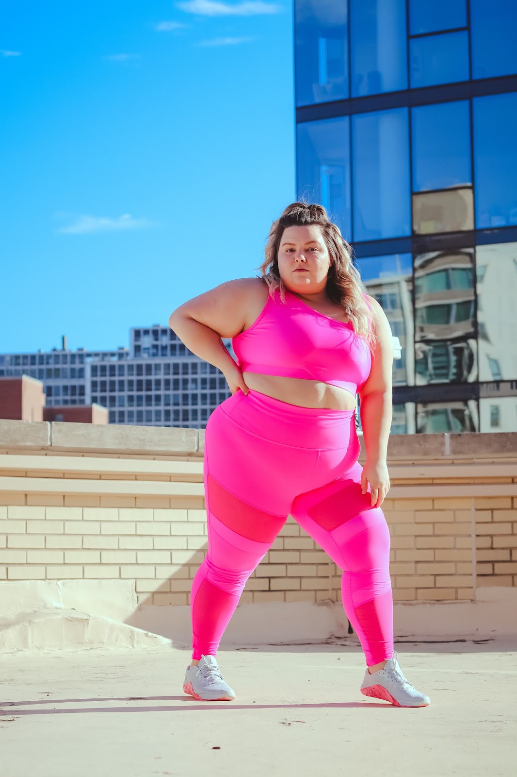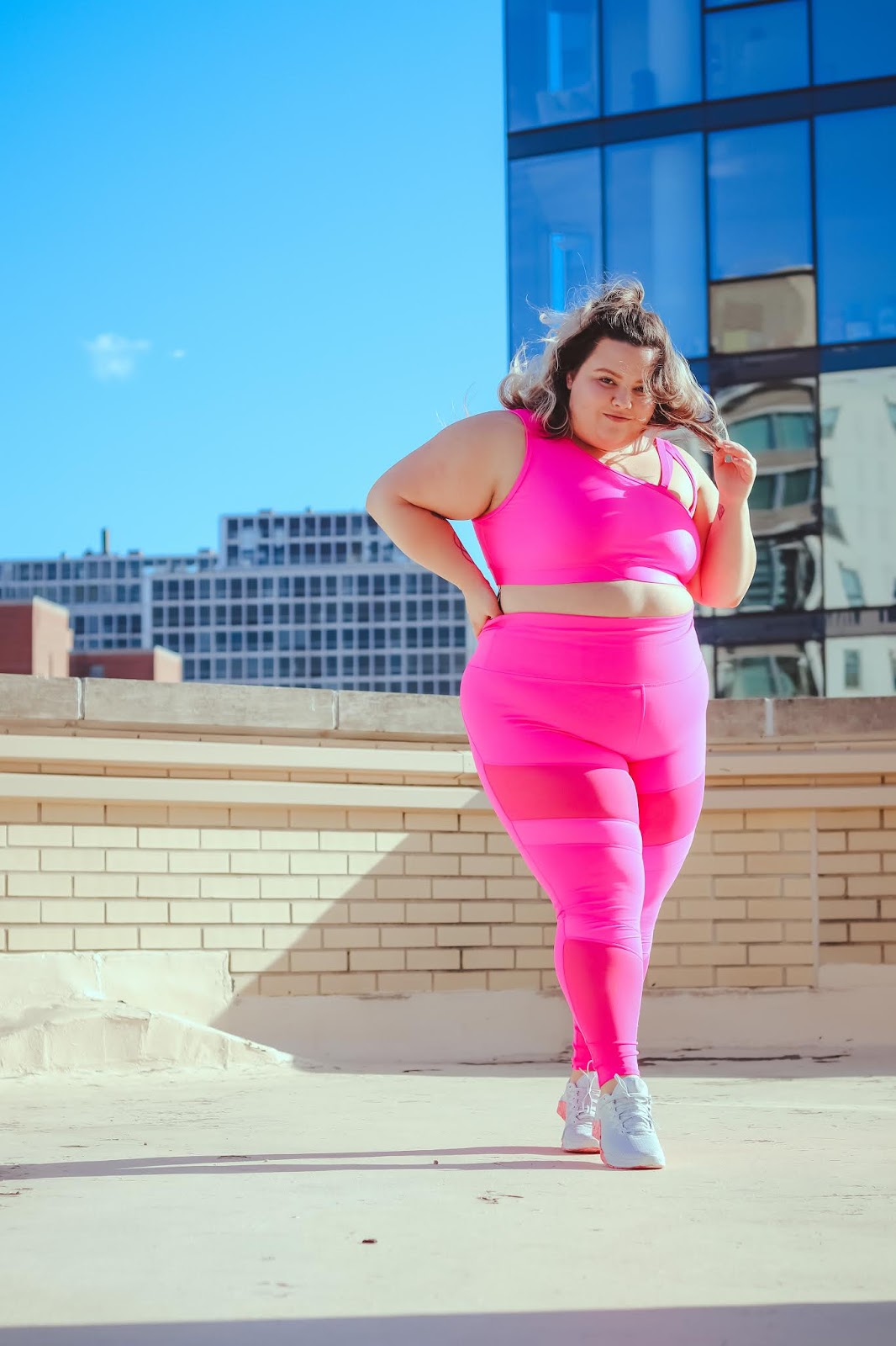 Well, when I started working out with my boyfriend Terry last year, I had a change of heart. I don’t know if it was him constantly gassing me up, or my first time being in a traditional gym setting since I developed a positive body image. But before I knew it, I was red yoga pants and a white crop top—two things I would have never thought I would wear to the gym. I also got a Fabletics VIP membership so that I could keep stocking up on plus size workout shorts! Since then, my gym confidence and outfit adventures have skyrocketed. As you can probably see from these photos, I am now confidently rocking plus size hot pink yoga pants.