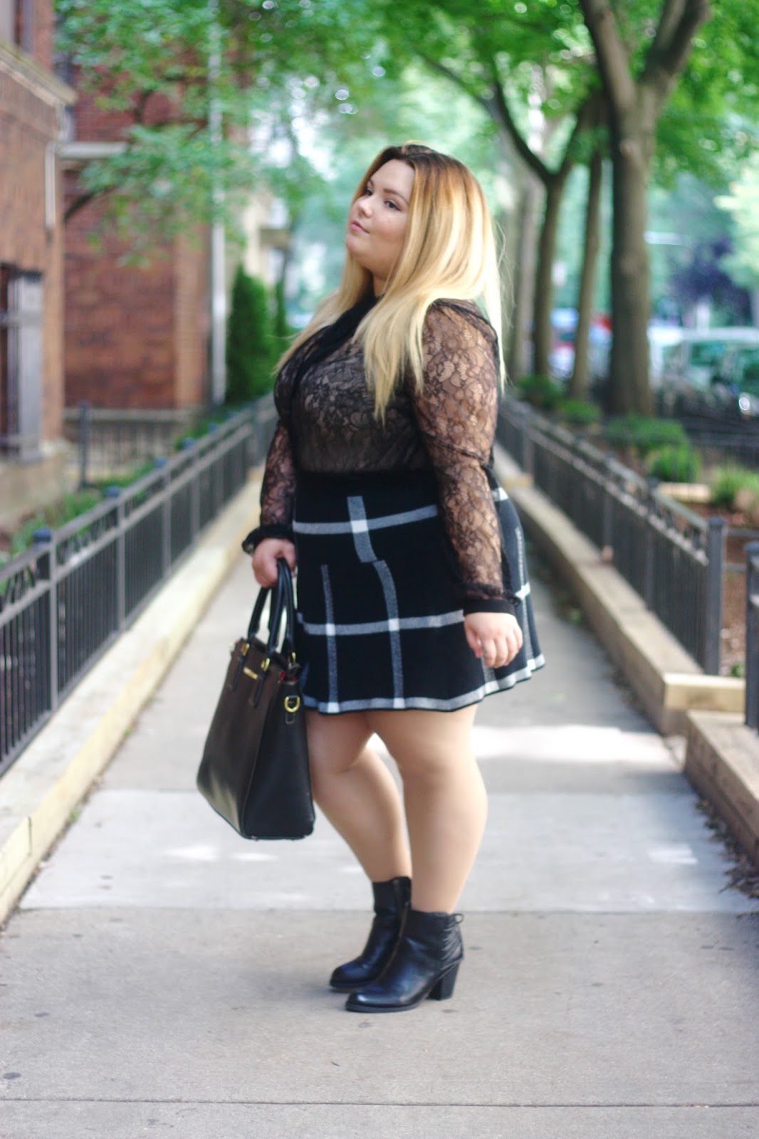 Plaid for fall. Original, I know. When I first bought this lace long sleeve with a neck tie, I couldn’t wait to pair it with this plus size plaid skirt. I am also planning on pairing this blouse with some jeans and a pair of nude or black heels. Either way, this chic top will give any outfit a sexy edge. I got these black ankle booties at Meijer while I was visiting their headquarters in Grand Rapids! I love the detail on the back of the boot, and to top it off, they are super comfortable.