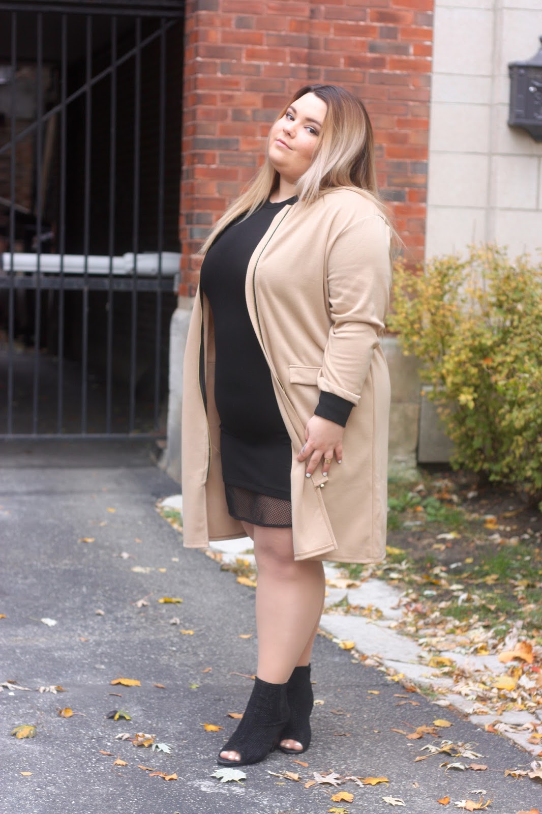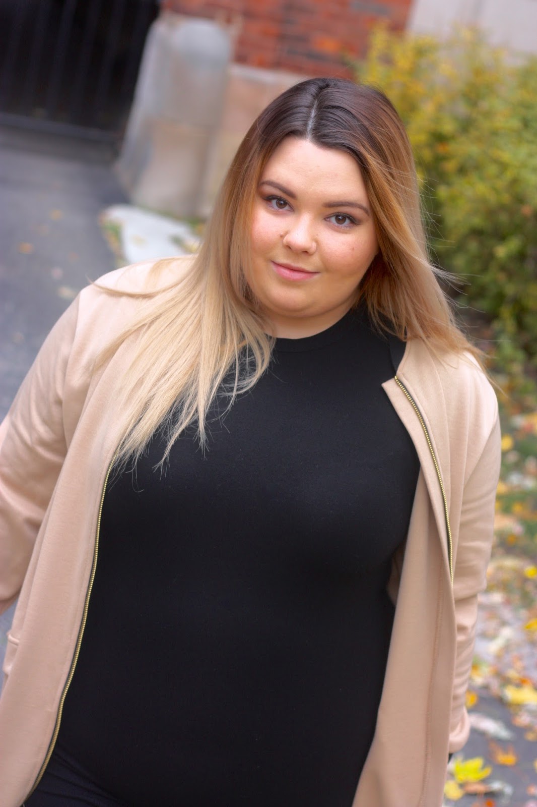 I’m a huge fan of bombers, but as the temps drop, I need a little more coverage than my go-to cropped bomber jackets. Which is why I scooped up this Rita Longline Bomber from Pink Clove, a U.K.-based plus size retailer. I like to keep my outfits simply-colored, so the nude tone with black trim really appealed to me. I also love that I could throw the bomber over an all black outfit to break up the dark tones.