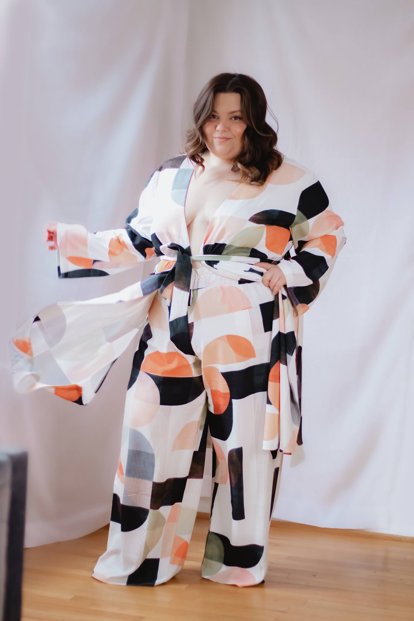Anyways, when I first started dressing up more, I noticed that I was feeling so much better about myself—even if I never left my apartment. I guess it’s true, when you look good, you feel good. So when I started to realize that my clothing directly affected my confidence, I started taking things out of my closet that I wouldn’t necessarily classify as loungewear sets for women and worked them into my day-to-day looks. Of course, sweatpants and cute undies were still on the agenda. I have had so much luck shopping for a matching lounge set and sexy lounge sets—because a girl still needs and wants to feel sexy in quarantine…don’t even get me started on how I wear plus size lingerie around the house for no reason. One of my favorite place to find a plus size lounge set is at Eloquii. The brand has created some beautiful loungewear pieces during the pandemic and while they used to be my go-to brand for plus size professional clothing, they have now become my one-stop shop for loungewear. If you love or want to incorporate more luxurious-looking loungewear, try looking at Eloquii. Their matching sets—like this Geo Coastal Dropped Shoulder Duster and Ruffle Waist pants are—incredible!