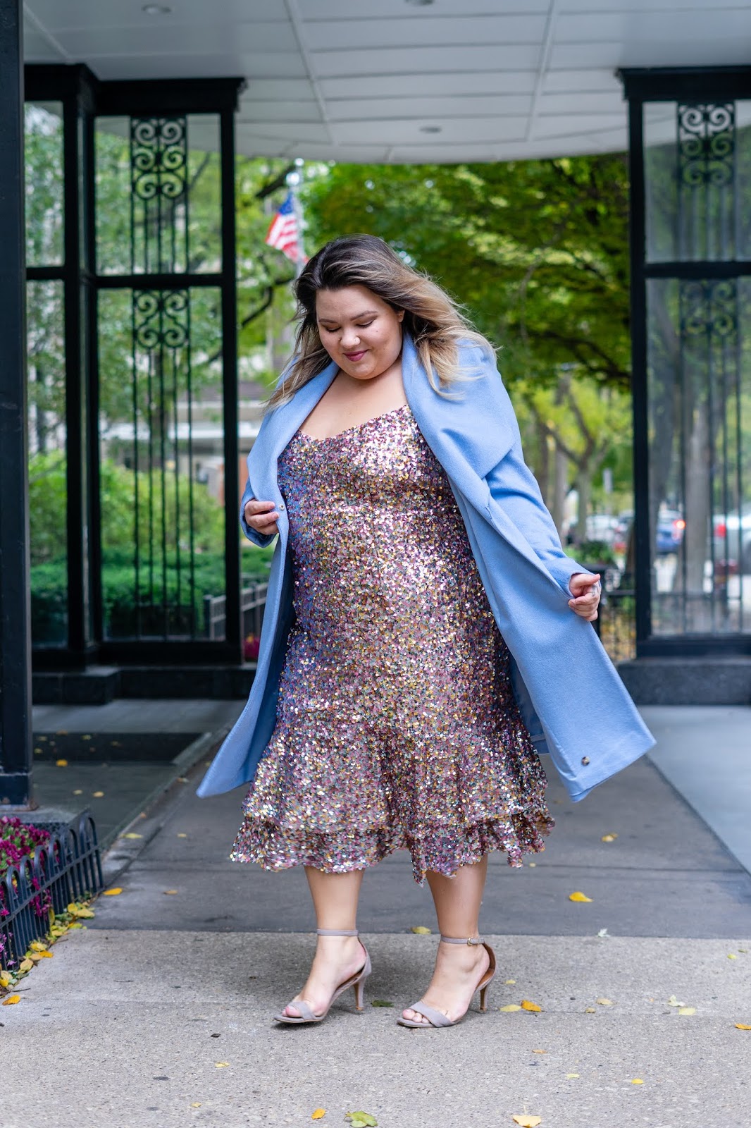 Naturally, I put both the dress and coat on, despite the rainstorm outside. I felt like magic. I have never owned a baby blue coat like this Cole Haan one, which comes in plus sizes! I think it’s really unique and beautiful. But honestly, I was a little nervous to try it—you know your girl likes to stick to neutral tones, especially when it comes to a staple item like a coat. However, sequins have always had my heart. When I was 18, sequins were everything! I wore sequins almost every day. Yeah, I didn’t have the most refined sense of style back then, but my love for sequins hasn’t gone away. To my surprise, sequins have made a reappearance over the last year. So when I saw this Adrianna Papell dress, I was so thrilled. I got an exclusive sneak peek of this dress so it’s not yet online at Macy’s, but when I get the link, I will post it here, and I will post it on my Instagram (so stay tuned)! But while we wait…I need ideas of where to wear this dress! Because my style is a little more low-key these days, I’m wondering where I can pull this dress off. Let me know in the comment section below, or let’s chat on Instagram! (username: @natalieinthecity_)