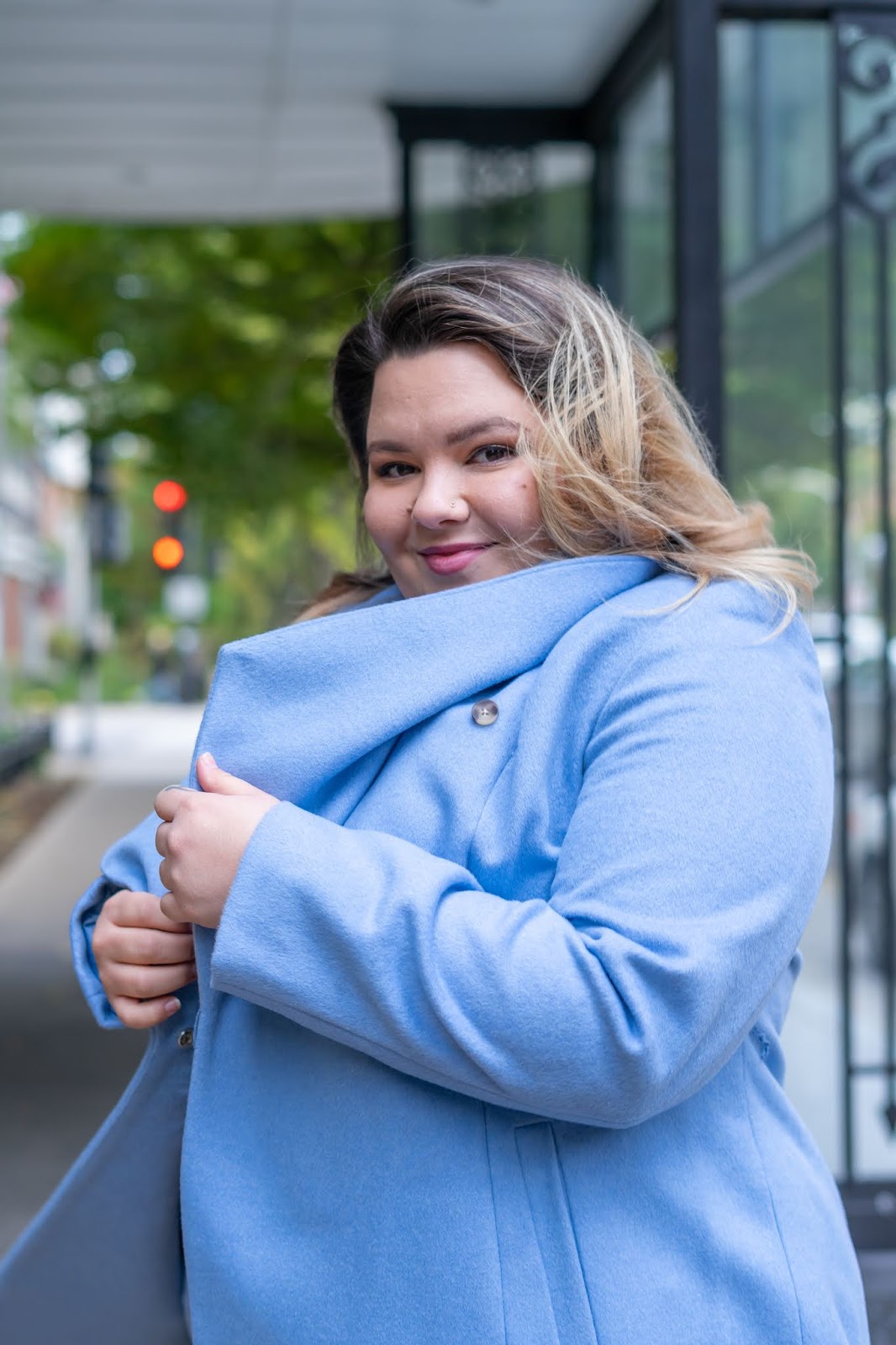 SIZING INFO: I am wearing a size 1X in the Cole Haan Blue Coat, which is a size smaller than my usual size, but I heard it ran a little big. I should have ordered my usual size because while the coat fits, I would like it to be a little looser! I am wearing a size 18W in the Adrianna Papell dress, which is my usual size, but I could have ordered a 16 because I love my dresses to fit tight.