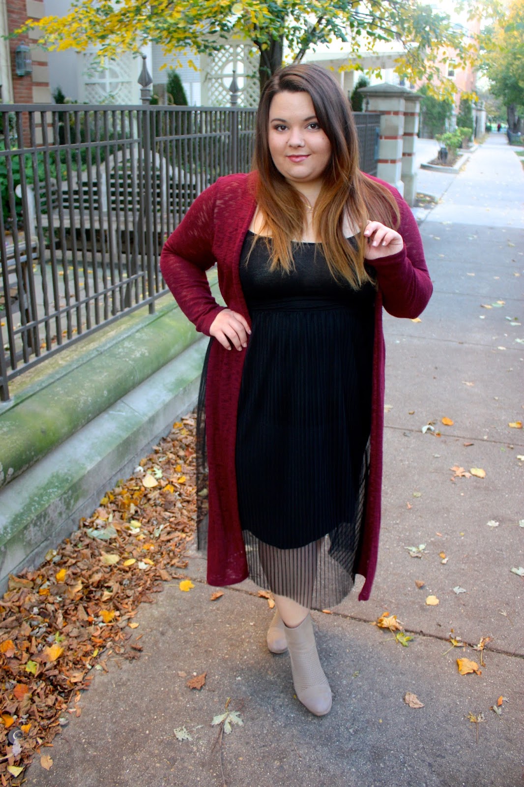 The black slip of the dress under the pleated tulle hugs my curves, which gives me a great look even with the flow of the dress. What do you pair with a duster / maxi cardigan? I need some inspiration!