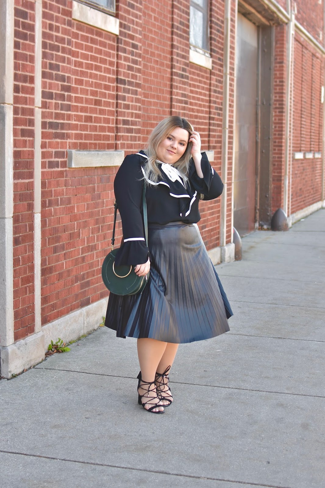 SIZING INFO: I am wearing a 2x in the leather pleated skirt, which is my usual size, and it fits perfectly. I am wearing a size 18 in the Eloquii top, which is my usual size, and it fits perfectly, too!