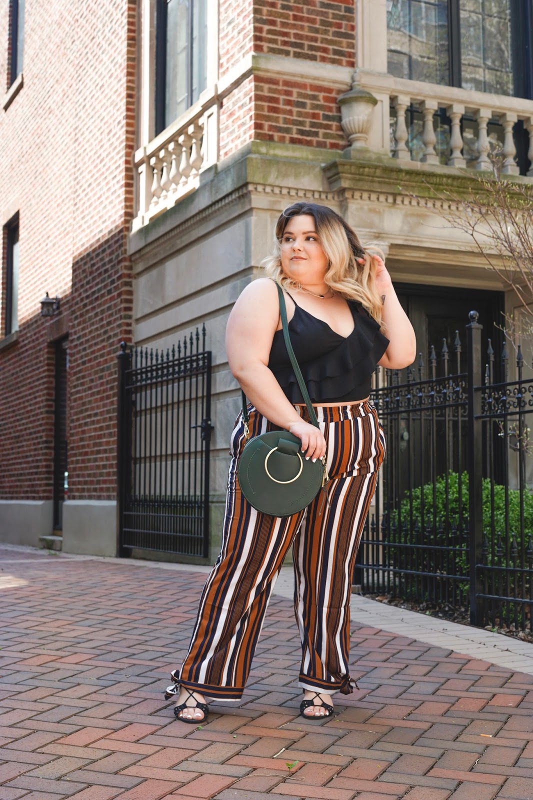 I might have a thing for striped pants. They are so bold, fun, and give any look an adventurous and chic feel. I love how the vertical stripes also elongate my short little legs. These Jazmine Stripe Pants are so cute, and I love the colors. When I wear stripes I try to stick to a monochromatic looks so that the outfit isn’t too busy. But I made an exception for these muted earth and navy tones because they add a new color palette to my closet without being too overpowering or busy. Since summer is starting to show itself, I paired the pants with this fun and sexy Vikkie Ruffle Top from Fashion Nova Curve. This look will definitely be on rotation this summer. I topped off the look with my green circle bag that I got from Zara a couple of months ago. If you are obsessed with stripe pants, too, I included striped pants of all colors in the shop widget below! Just click the arrows to browse through and find your perfect pair. If you love this look, you can get it 20% off with the code: natinthecity.