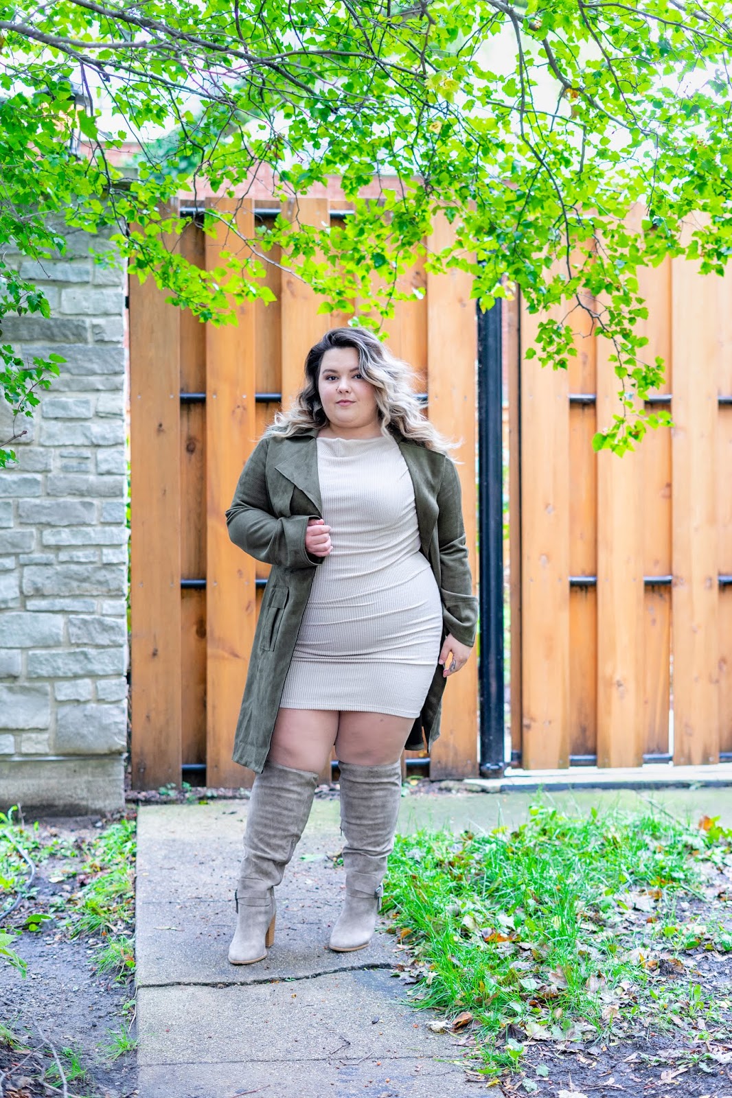 SIZING INFO: I am wearing a size 3X in the Alyssa Suede Jacket, which is one size larger than my usual size, and it fits well, but the sleeves are a little long. I sized up because I didn’t know if the jacket would be too tight. However, I think the jacket runs true to size! I am wearing a size @X in the Dolman Daze Mini Dress in Khaki, which is my usual size, and it fits perfectly! I am wearing a size 9 wide and wide calf in the Sirena Block Heel Boots in Taupe, which is my usual size, and the boots fit perfectly.