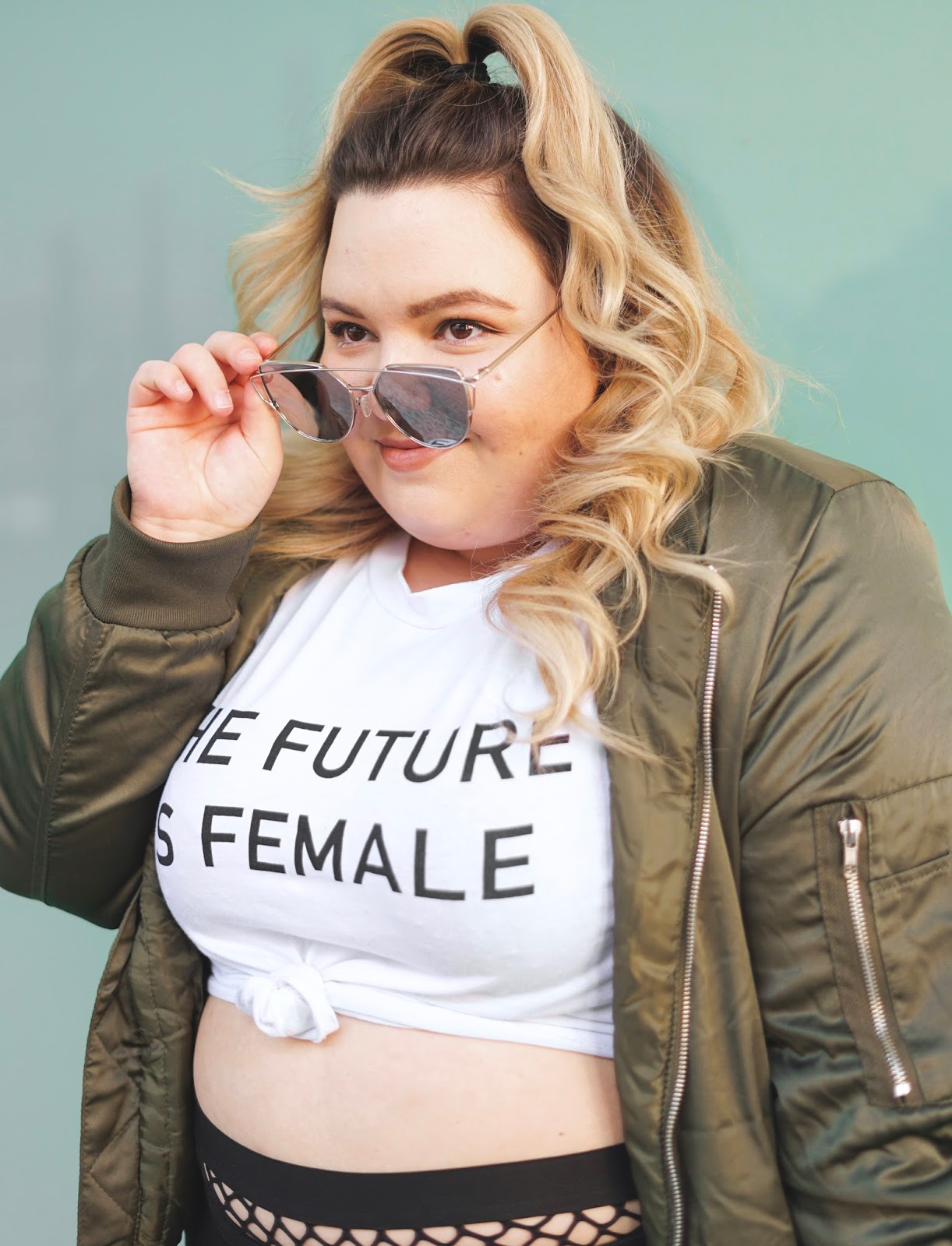 SIZING INFO: I am wearing a size 2x in both the Tax Joggers and The Future is Female T-Shirt, which is my actual size, and they both fit perfectly. I am wearing a size 3X in the Don’t Tell Em Bomber, which is one size larger than my usual size. I sized up in the bomber because I wanted an oversize fit.