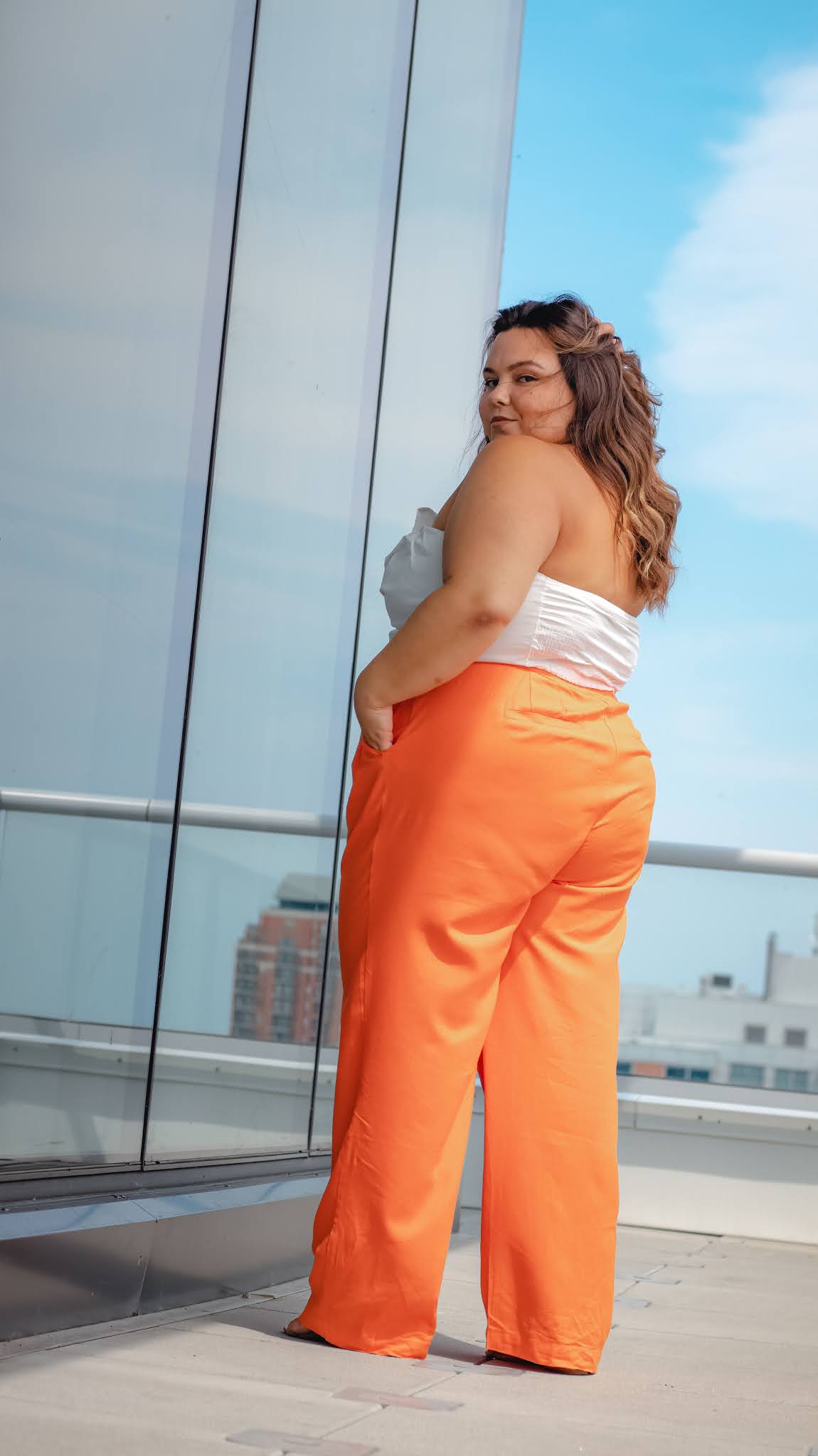 Even though I’ve been staying home most of the time over the past year and a half, I have been filling my wardrobe with wide leg statement pants that I absolutely love. I feel like I can wear these pants anywhere—from the office to dinner and then to brunch with my friends. I often love pairing wide leg pants with a fitted crop top or a tucked in bodysuit. For this outfit, I’m wearing plus size wide leg pants from Eloquii and Eloquii’s plus size bustier. I haven’t got these pants tailored to fit me yet but they are on the list for my next trip. When I tell you I’ve been shopping for wide leg pants like crazy, I’m not joking. These pants are different from most of the other styles I have in my closet though because they are made of linen. So they’re perfect for summer and the warmer days because they’re very breezy and lightweight.
