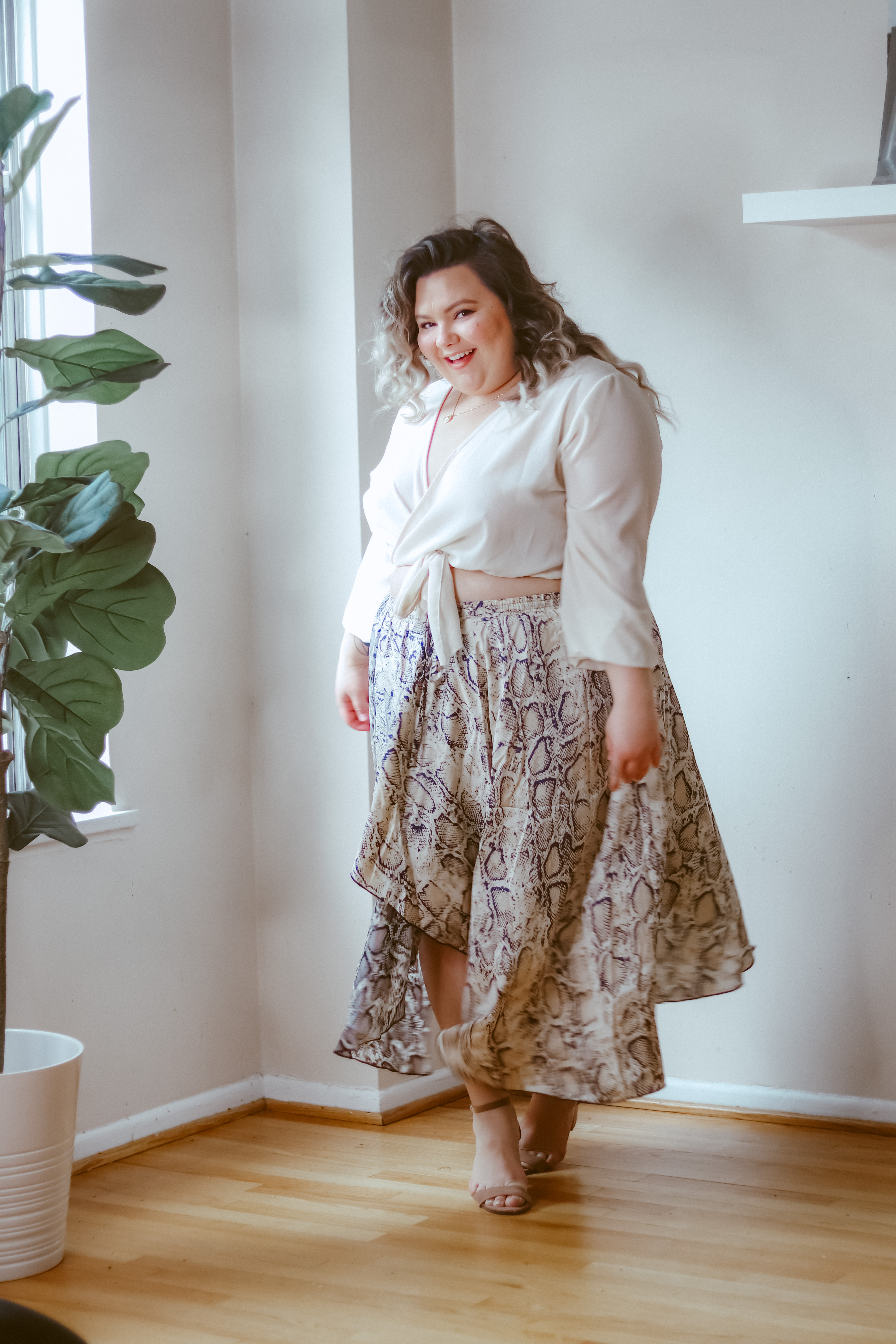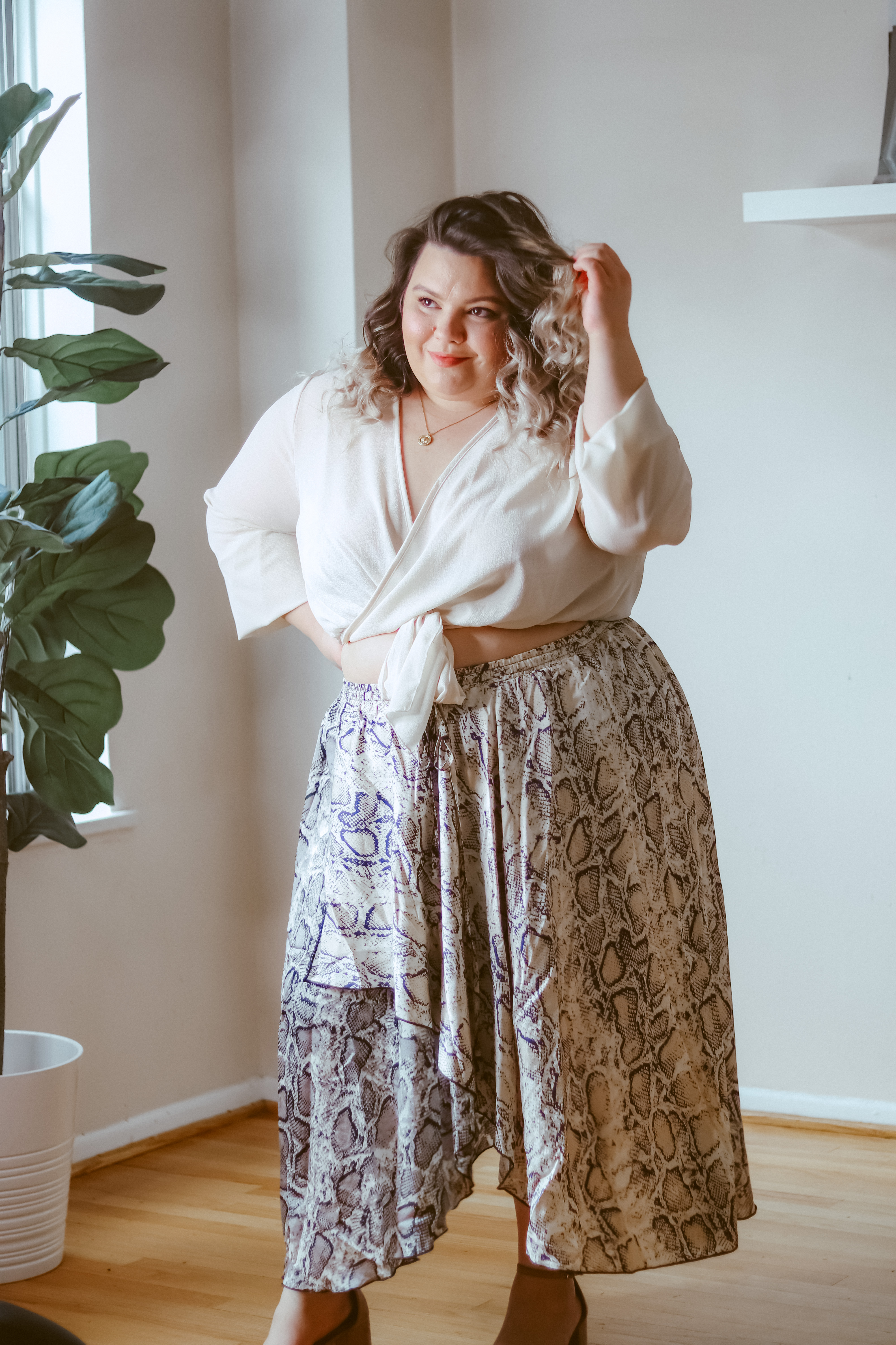 Before we dive into the details of this cute plus size snakeskin midi skirt and outfit, here is a little COVID-19 update. In Illinois, we are starting to move to phase 3, which means some ways of life will go back to normal while we still exercise caution and practice social distancing.
