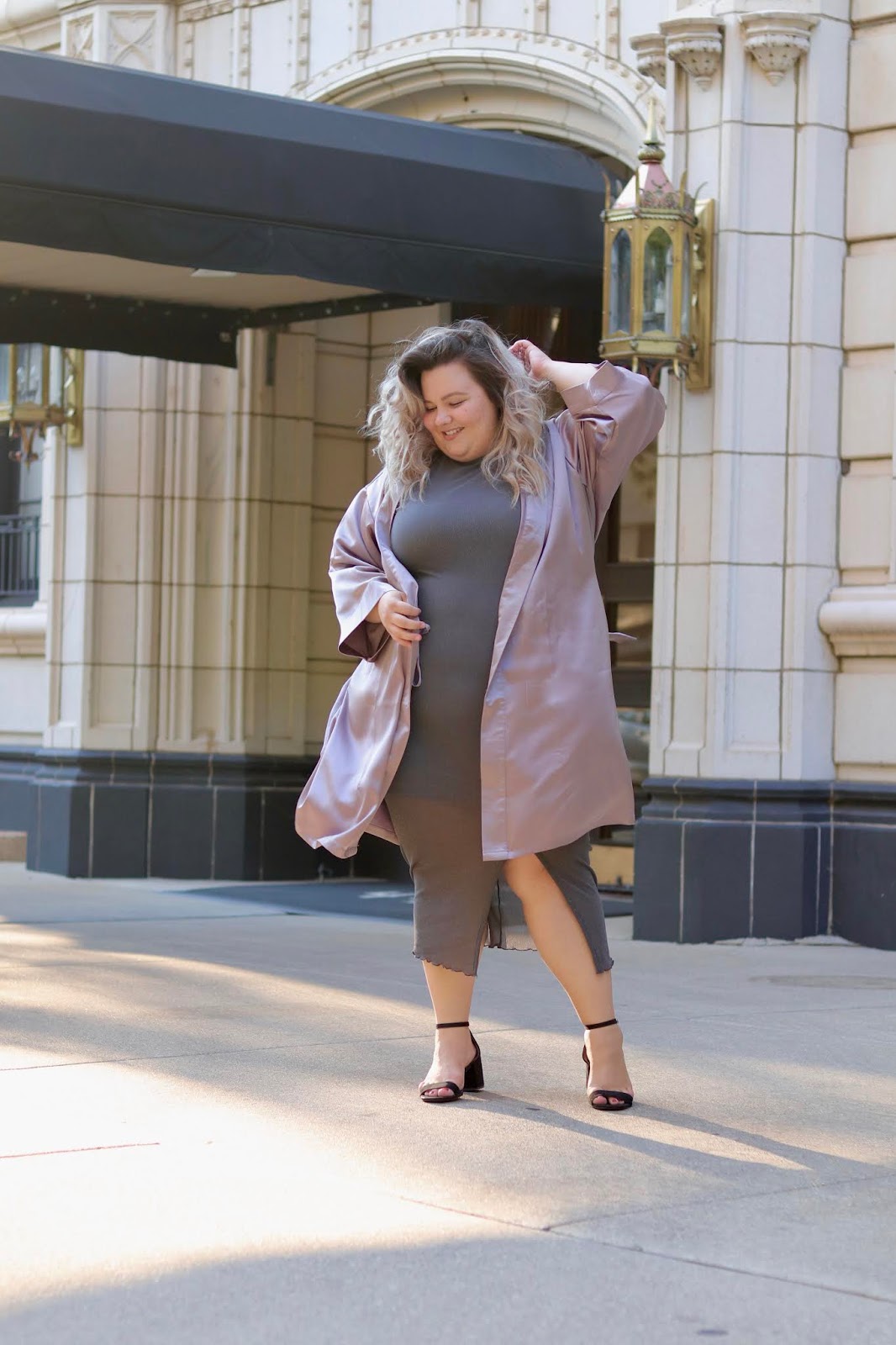 I have always wanted a satin robe to wear outside of the bedroom ever since Nadia Aboulhosn launched her clothing line a couple of years ago. I’ll never forget, she had this rose gold duster robe that was just beautiful. However, I hesitated on getting it because I feared that I wouldn’t wear it much. And I don’t know if I have totally committed to wearing this satin robe out of the house just yet, but it’s growing on me. I found this entire look at Soncy, a new plus size boutique! This Kimono She Better Don’t Duster caught my attention immediately, and because I had pulled off a complete lavender look a couple of months prior, I decided to take another shot at it. So I ended up finding this I Can See Clearly Now Mesh Dress, which I thought would go perfectly with the kimono!