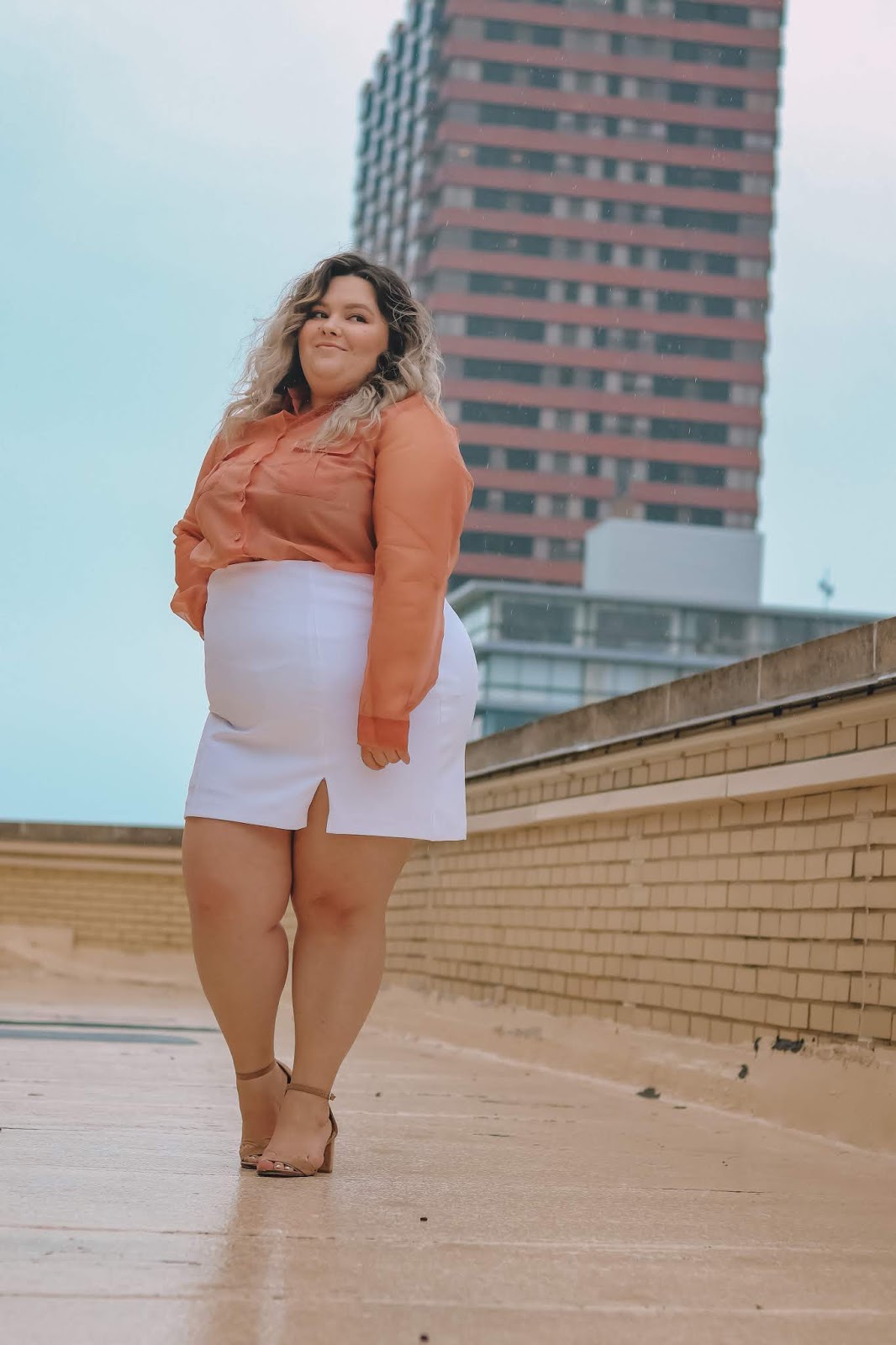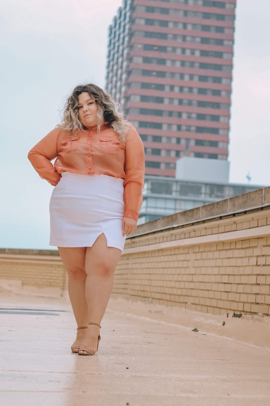 My newest addition to the wardrobe is this Plus Size Organza Collared Shirt from Forever 21 Plus. Most of the see-through pieces I have are black, so I wanted to add some color to my rotation. I paired the top with this adorable Plus Size Bodycon Mini Skirt. I snapped this outfit on my rooftop since I am practicing social distancing/self-quarantine to flatten the curve of COVID-19, but this look made me daydream about being somewhere warm like Miami. I love the way the skirt fits me, it’s lightweight and curve-hugging. I can’t wait to pair this shirt with jeans and other looks because it’s so versatile!