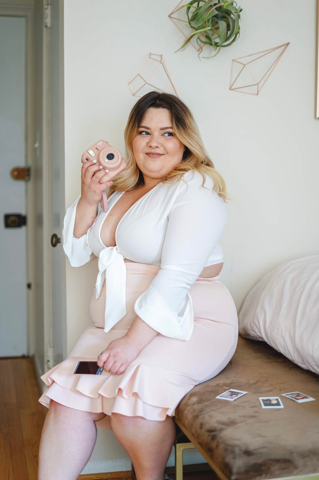 I’m wearing the White Tie Front Frill Sleeve Blouse from Pretty Little Thing’s Plus collection, and I paired it with the Nude Frill Hem Midaxi Skirt for a super girly and playful look. I took a couple of selfies and my photographer, Rorie Raimondi, caught it all!
