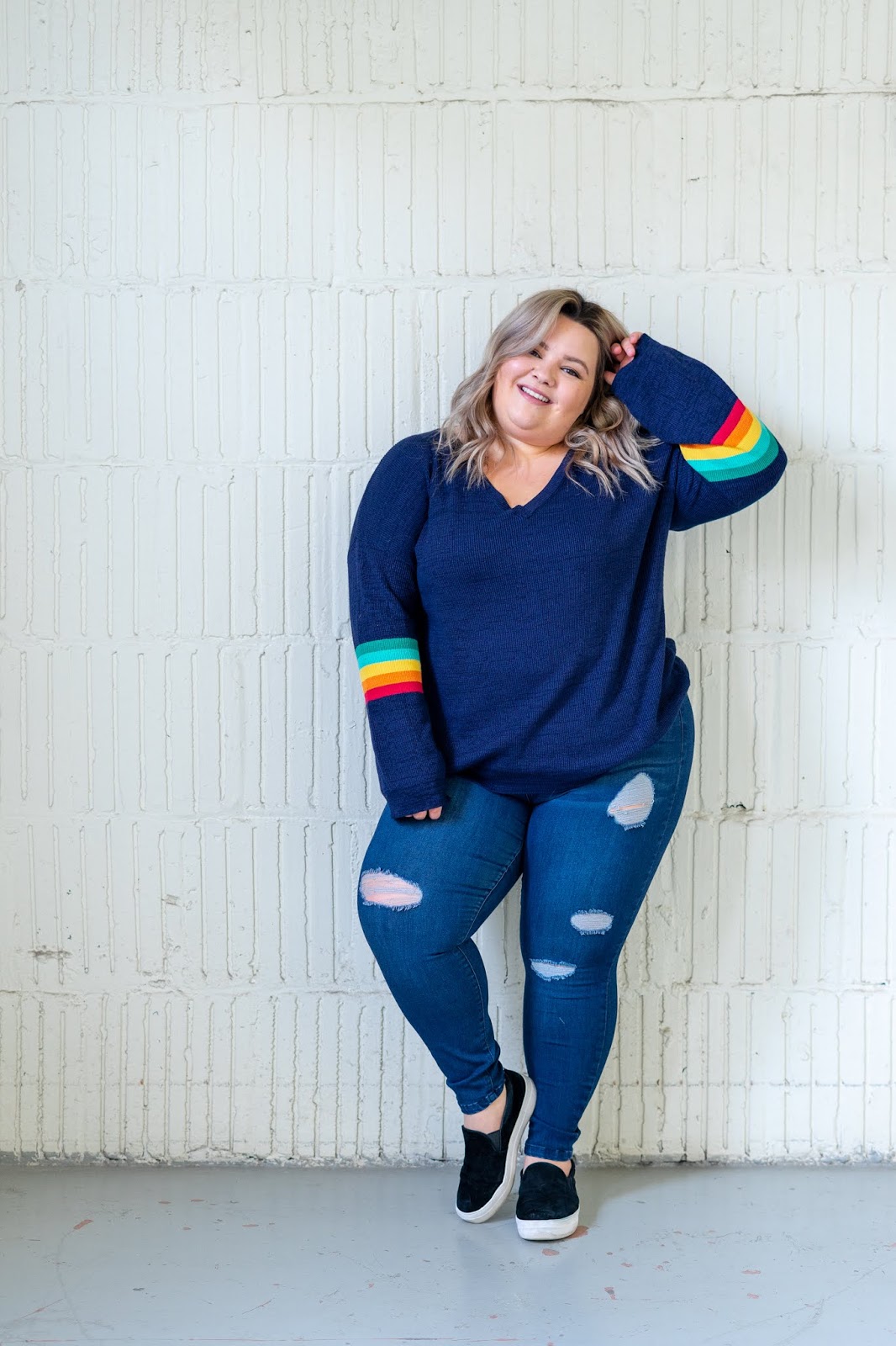 Can you guess which kind of shopper I am? Based on my theory, I should really hate subscription box services, but I don’t. While it may take some extra patience and communication with my virtual stylist, I usually get really fun, true to my style outfits from them. The reason why I love using subscription box services is that they introduce me to trends and brands I wouldn’t have usually tried on my own. For example, this Honey Punch Navy Sweater with Rainbow Sleeves was in my most recent Stitch Fix box, and while I absolutely love it, I would have never sought it out on my own. And do you see these jeans I’m wearing? They came from a Dia & Co. box. The brand of denim is Molly + Isadora, which I had never heard of before I got these jeans, and they have since become my favorite pair because they are so comfortable. And let’s work our way down to the shoes, shall we? I got these bad boys because I asked my Stitch Fix stylist if she had any platform slide on sneakers because I needed a pair in my wardrobe. And sure enough, she sent some along! Being able to leave feedback and ask for specific items is another reason why I love these subscription services.