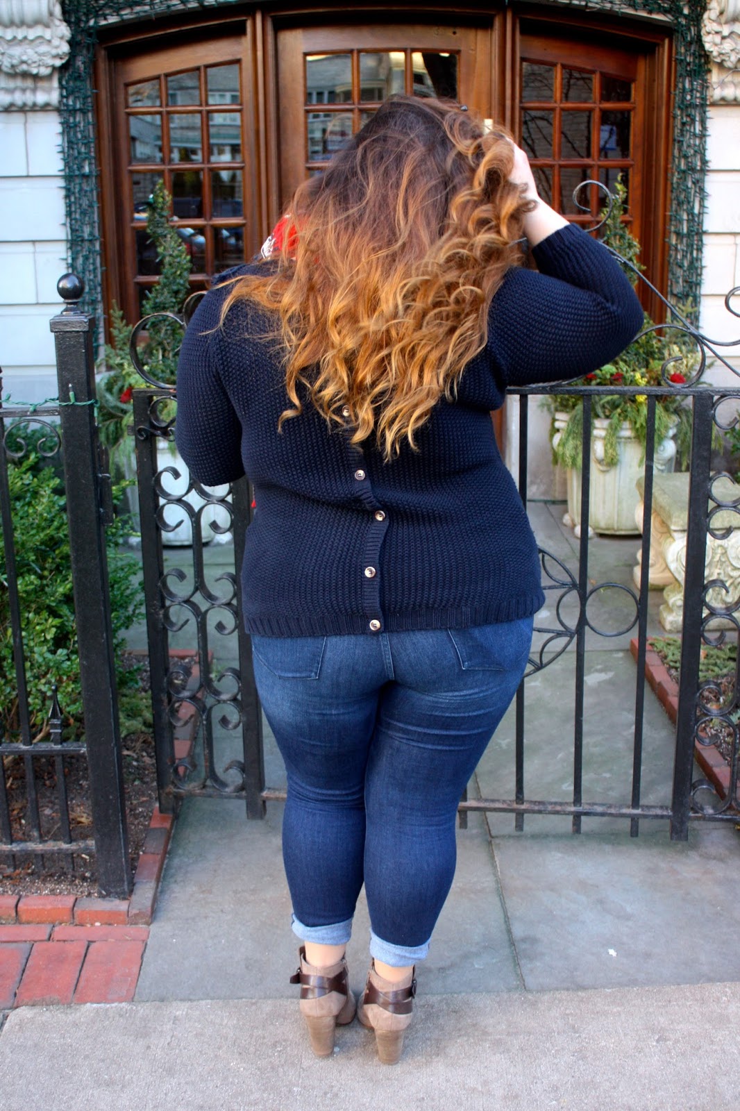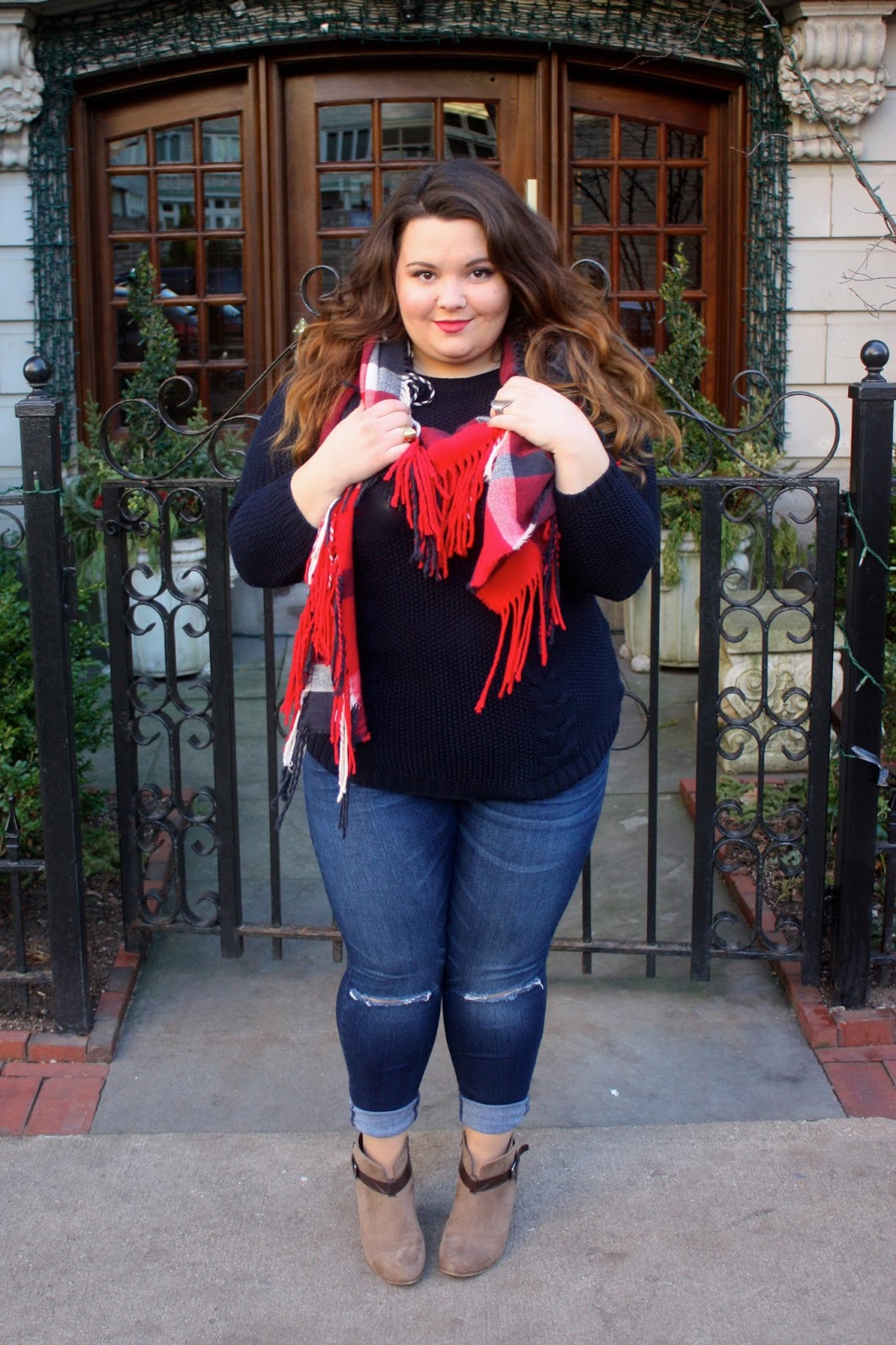 cable knit sweater, button down back sweater, red plaid scarf, fringe scarf, holiday style, natalie craig, natalie in the city, chicago, plus size fashion blogger, plus size, jeans with holes in the knees, taupe ankle boots with a brown strap, ankle booties, how to wear ankle boots, ps fashion ootd, blogger, fashion