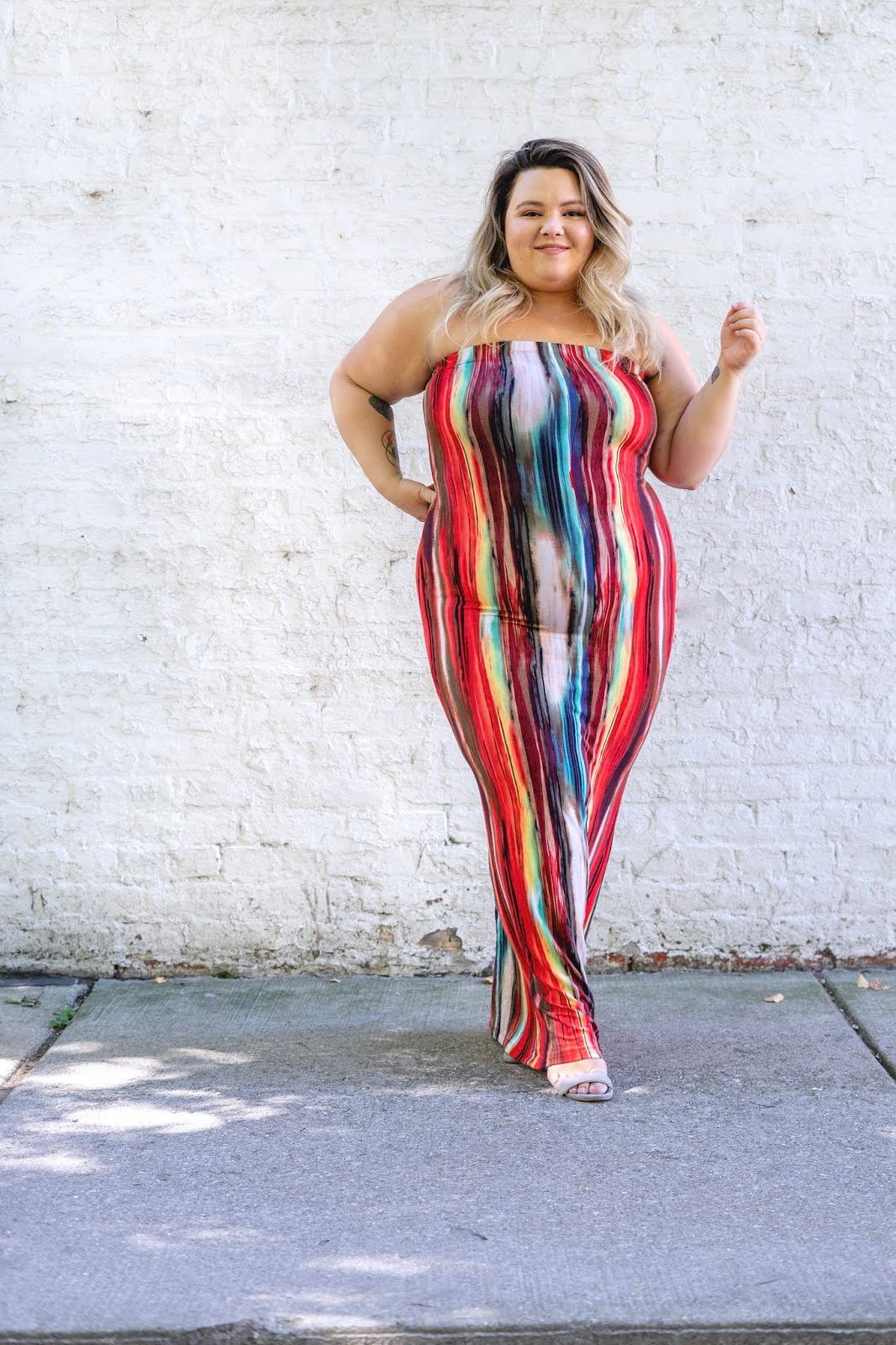 And I figured this Work of Art Dress from Fashion Nova Curve was the perfect way to kiss the season goodbye! Not only is the pattern and coloring of the dress show stopping, but I love the way the dress fits and hugs my curves. I’m obsessed with this dress, and trust me that I will find a way to incorporate it into my fall wardrobe! Trends that were popular in the ’90s are having a huge moment right now, which is another reason I gravitated toward this tube top dress. Do you remember the last time you wore a tube top?