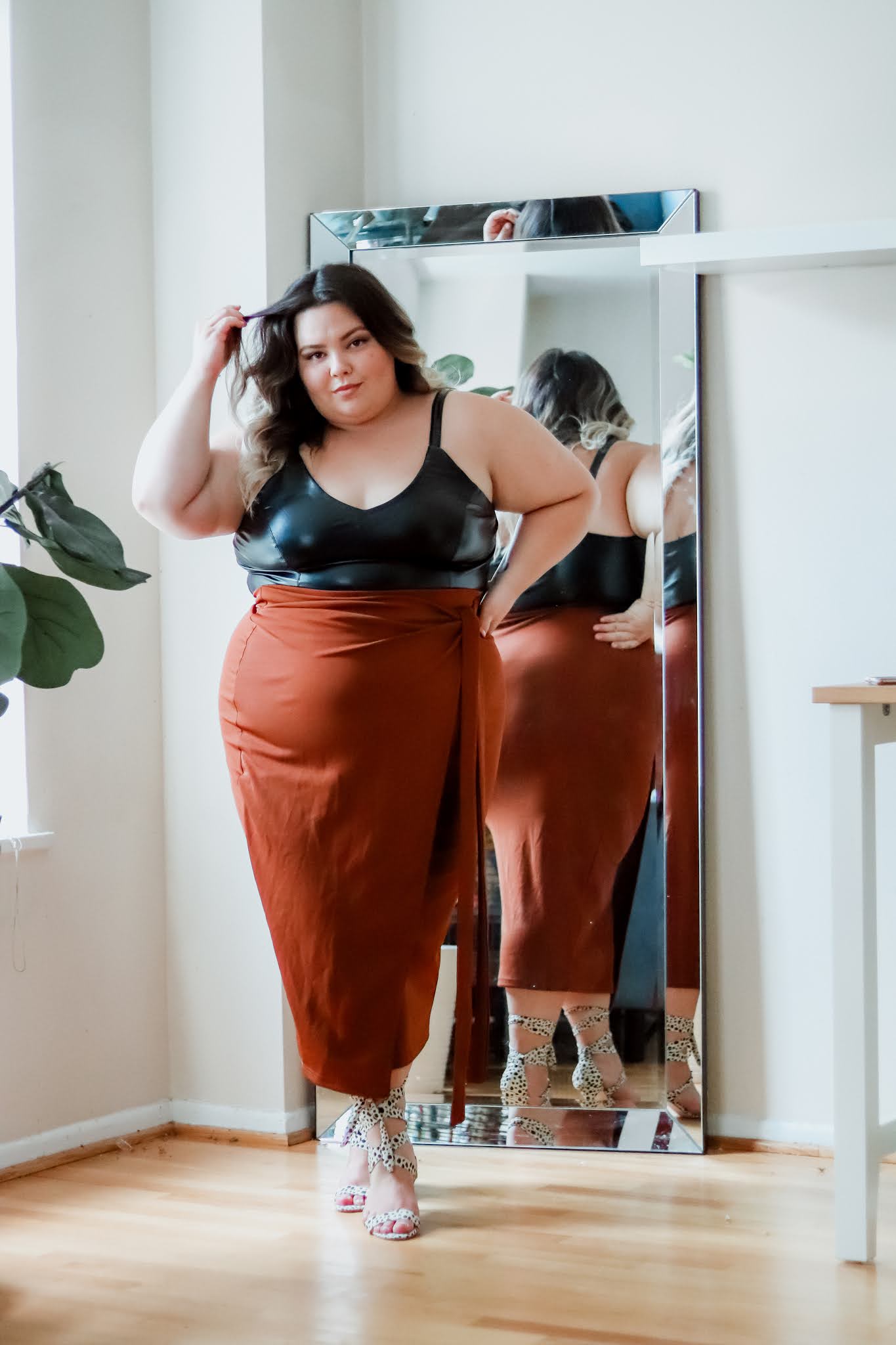 We come here for the fashion, right? Of course! Well, without further adieu, let’s start with the mink skirt look. I am wearing the Jillian Tie Tank Top from Universal Standard paired with a black ruffle mini skirt from Meijer. In my next look, I am wearing a Rust Tie Wrap Midi Skirt from Soncy and Eloquii’s Faux Leather Tank.