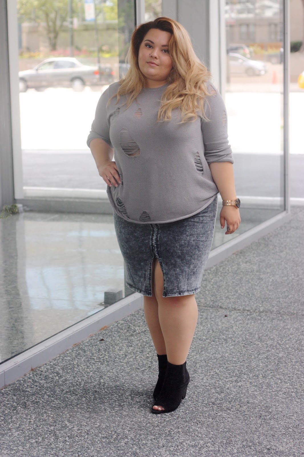 zipped up midi skirt, grey acid wash denim, plus size fashion blogger, natalie craig, natalie in the city, love lianca, distressed sweater, easy sweater, sweater with holes, open toe ankle boots, chicago blogger, midwest blogger, natalieinthecity.us