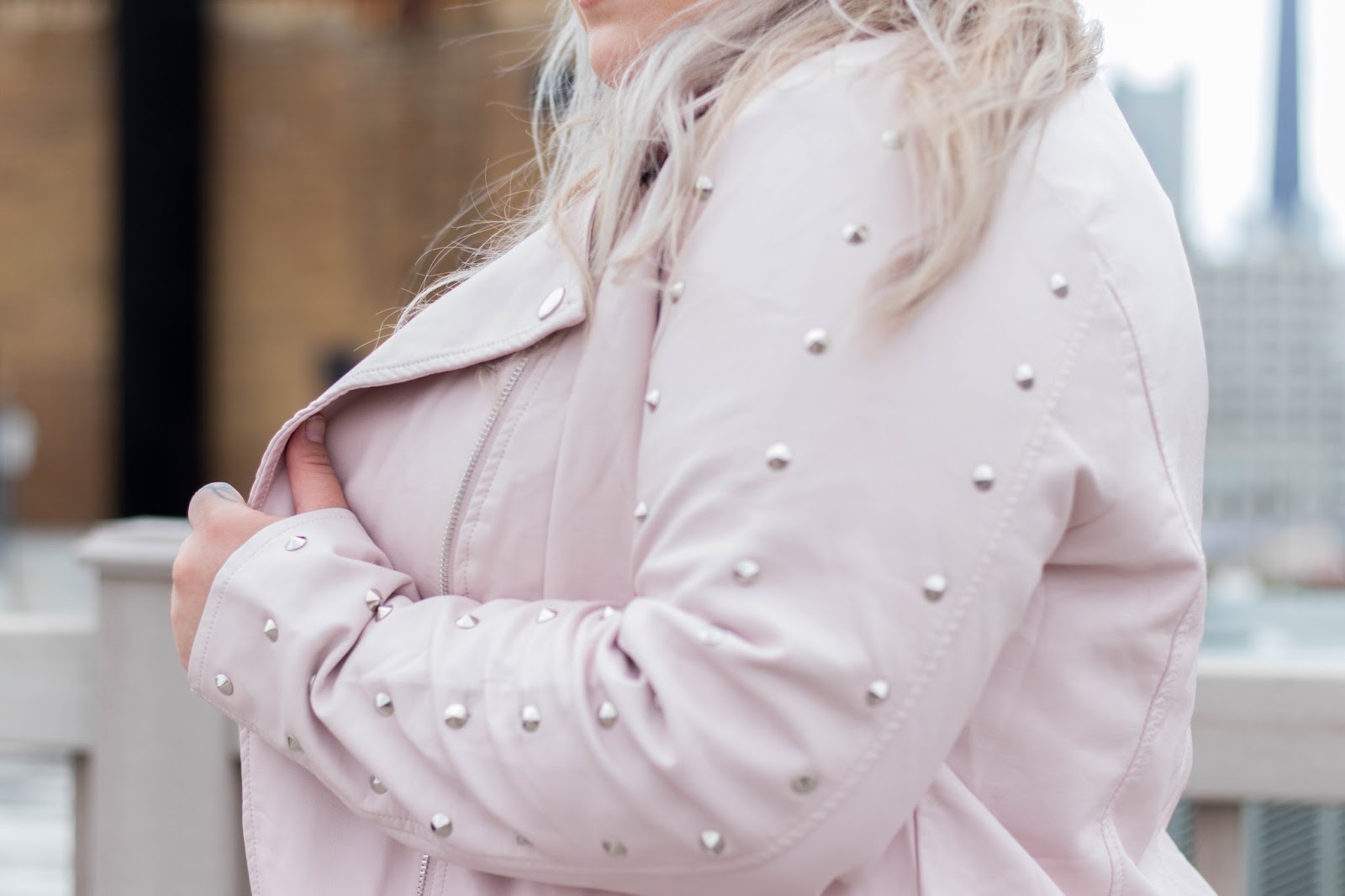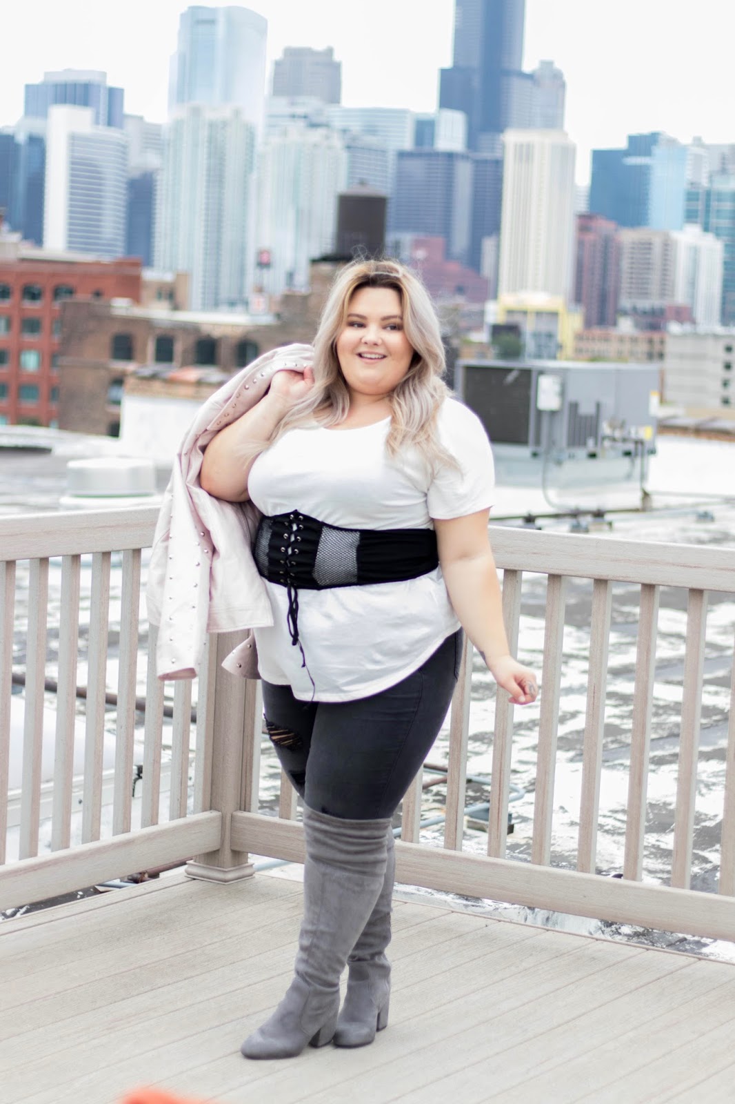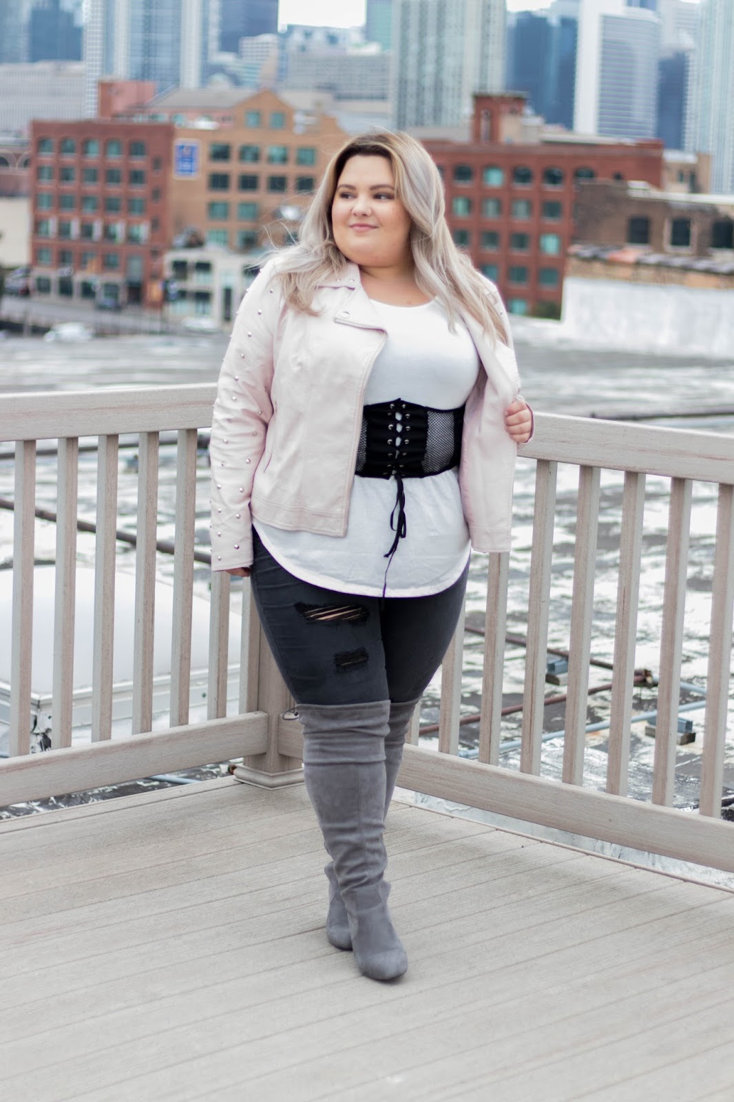 SIZING INFO: I am wearing a size 8 in the knee-high boots, which is a half size down from my usual size. The reason I sized down was because I have worn the size 9 boots from Charlotte Russe before and I felt that they were too big. When I sized down to a size 8, the calf is a little tighter, but I could get them up to my knees. I am wearing a size 16 in the skinny jeans, which is my usual size, and they fit perfectly. I am wearing a size 2x in both the corset detail crew neck and the moto jacket, which is my usual size, and they both fit perfectly!