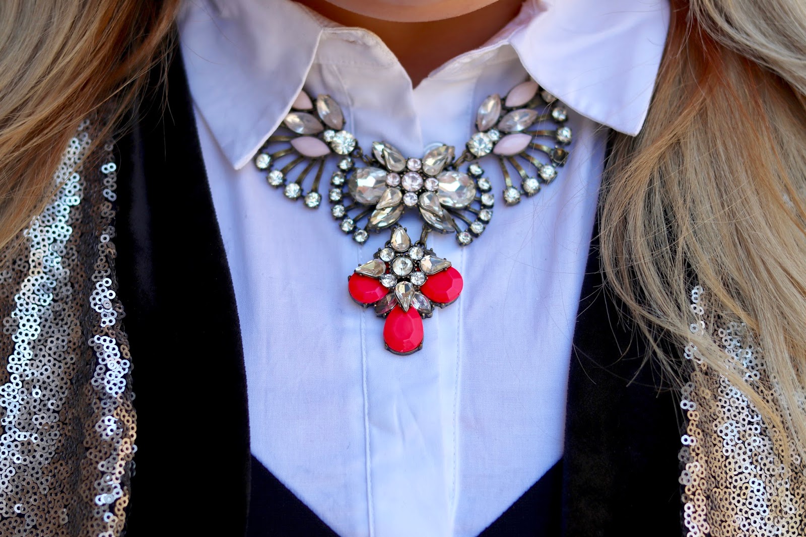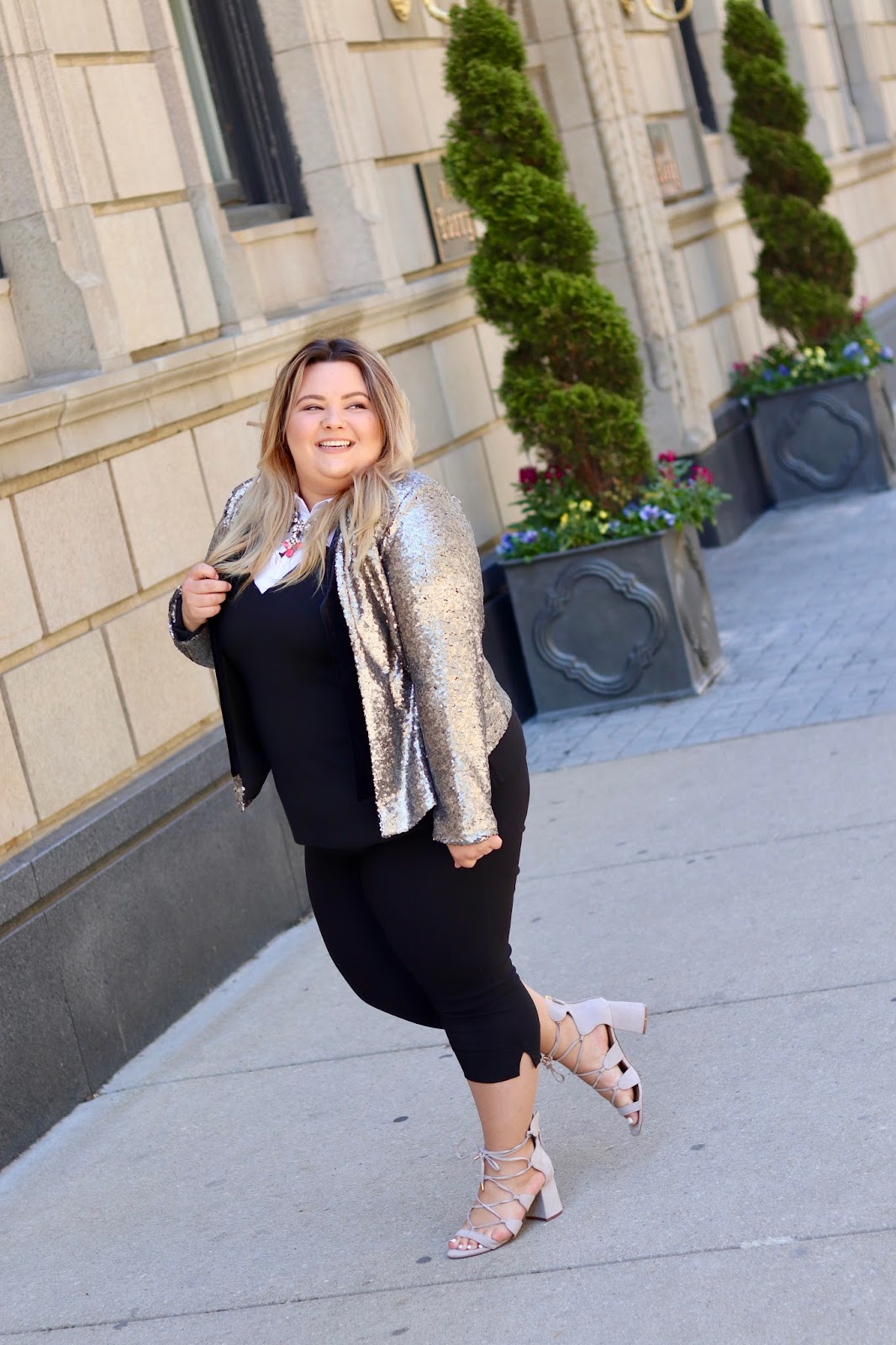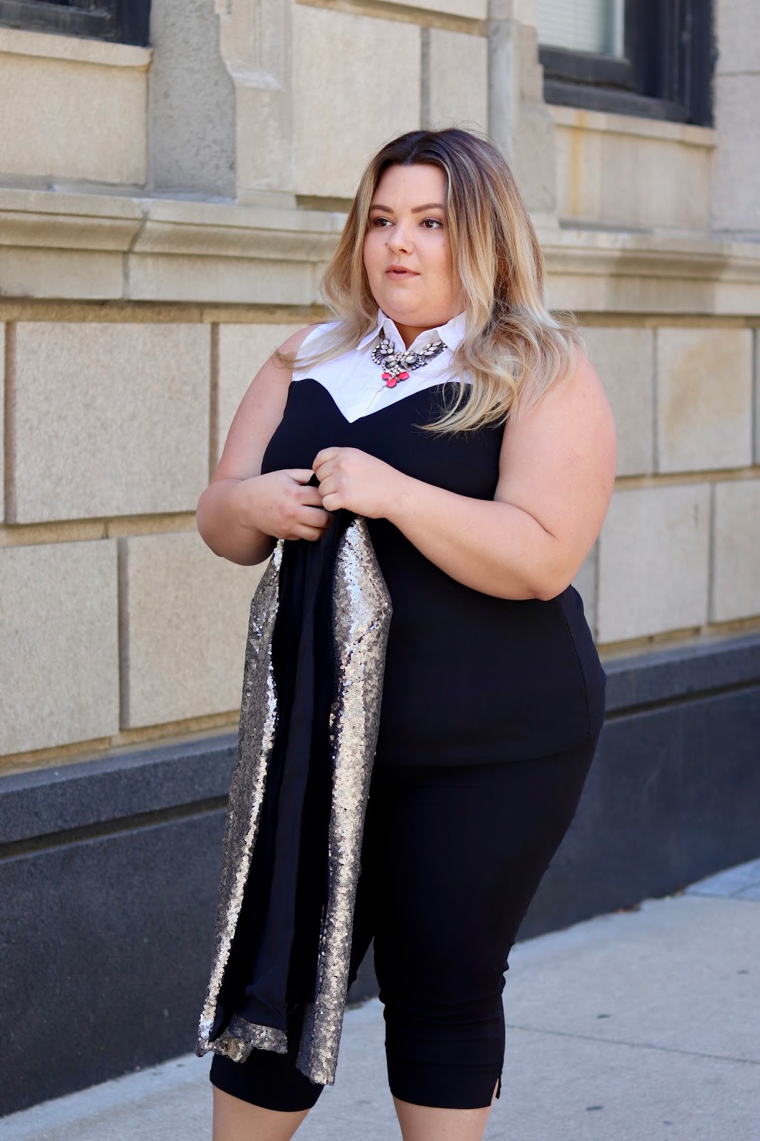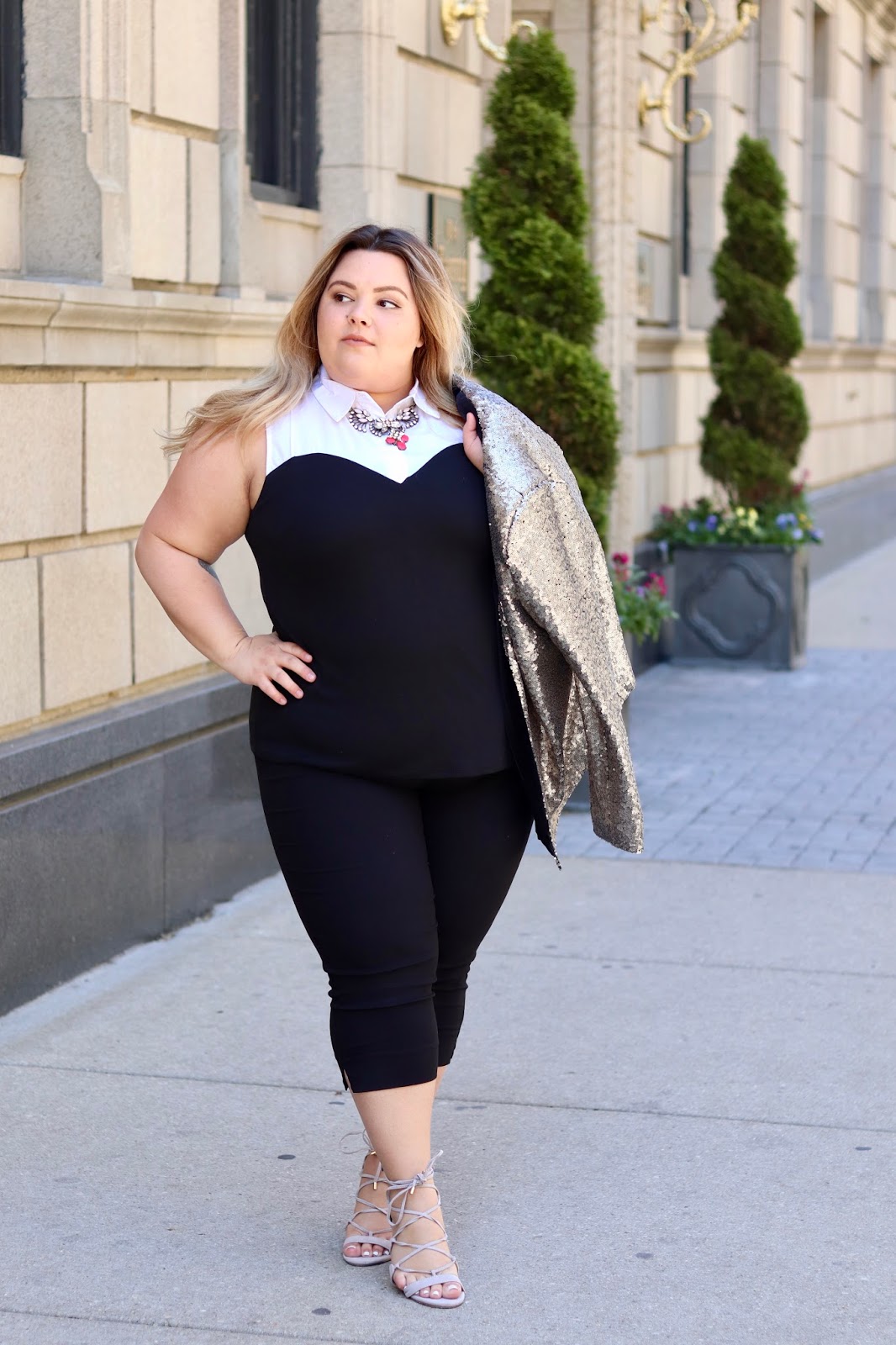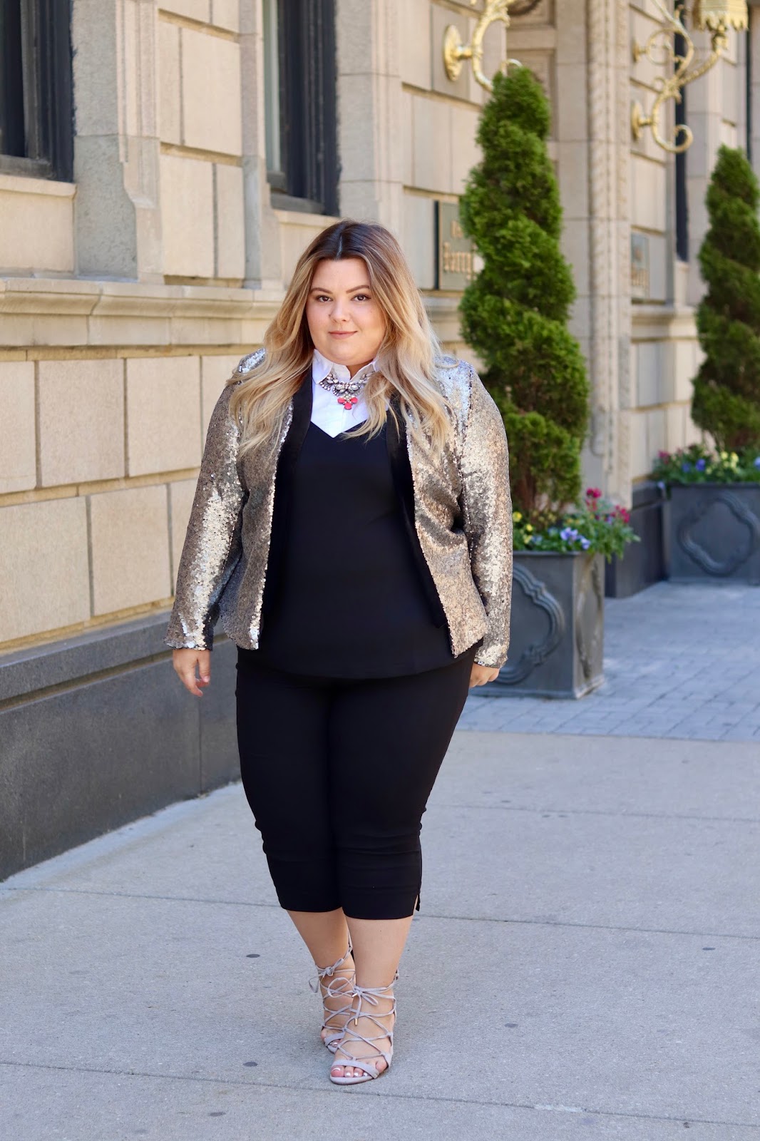 At work, I usually wear a pair of skinny, stretch dress pants—in either black, grey, or white. I love capri dress pants—like the ones I am wearing—for the warmer spring and summer days. I try to keep my bottoms as basic as possible so I can put all of the excitement into my tops and accessories. With that being said, I topped the outfit off with this sleeveless collar top from Eloquii, a statement necklace, and a sequin blazer. OK YEAH, a sequin blazer might be a little extra for the office, but the sequins are a dull enough silver tone that are totally appropriate for work. I bought this sequin blazer from Eloquii a while back, and it has sold out since. But here is another black sequin blazer and a cute sequin bomber to hold you over!
