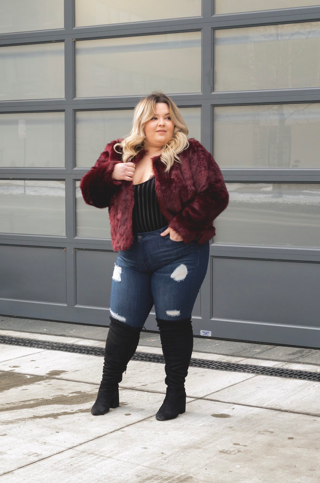 Dia & Co recently sent me a box of clothing to try out, and inside was this Plus Size Rebel Wilson x Angels Faux Fur Jacket and a pair of Pin Up Super Skinny Jeans, also from Rebel’s line. To learn more about Dia & Co., check out this blog post: NOT A DRILL, I’M WEARING A TUTU. I usually don’t wear too much faux fur because it often adds too much bulk to my look, which typically looks unflattering. However, since this jacket was cropped, I decided to pair it with skinny jeans and a body suit to highlight my curves. I got the striped bodysuit from Forever 21 Plus, and as soon as I saw it, I knew it would go perfectly with this look. My Tulip Allover Lace bra from Curvy Couture is peaking out from the bodysuit, and I totally love this little, unexpected detail. I’m also wearing my absolute favorite Wide-Calf, Over-the-Knee Boots from Charlotte Russe (Check them out in gray: DENIM IS A GIRL’S BEST FRIEND)