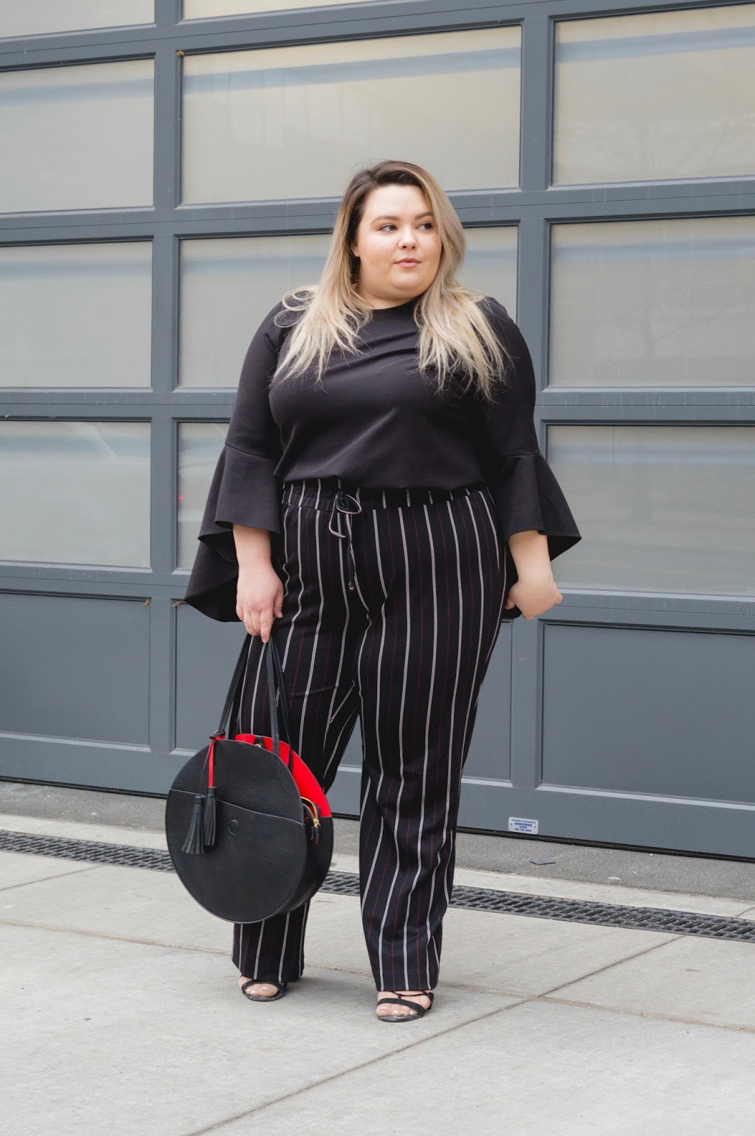 Now, fast forward to last week when I had a blogging event to attend and I thought these wide-leg, striped pants would make the perfect look. But again, I found myself wondering what shirt I would wear. I tucked in tank tops and T-shirts, threw on bralettes, and even played with the idea of wearing a cape. However, nothing seemed to work just right. I almost gave up on the pants until I remembered this Elbow Flounce Sleeve top from Eloquii. Although this blouse is one of my favorites, I never even thought about pairing it with these pants. As soon as I tucked the top in, I knew this look was the winner. And it was even a hit among you all! I got messages on Instagram as soon as I posted the full look asking about my pants and my bag! While I did shop the pants on clearance and I cannot find the exact ones in stock, I have included some just like mine in the shop widget below! You can learn more about this Circular Tote Bag here: XOXO or shop it below!